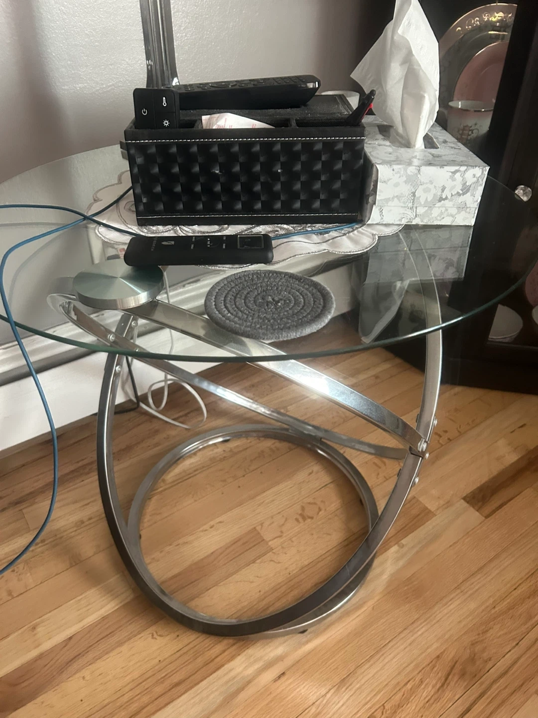 This is a glass coffee table with a unique chrome base design. It's in good condition and would look great in any living room. The table has a round glass top and a circular chrome base that adds a touch of modern elegance to your home. It's perfect for displaying decorative items or enjoying a cup of coffee