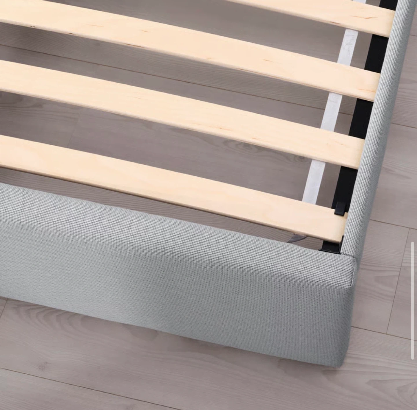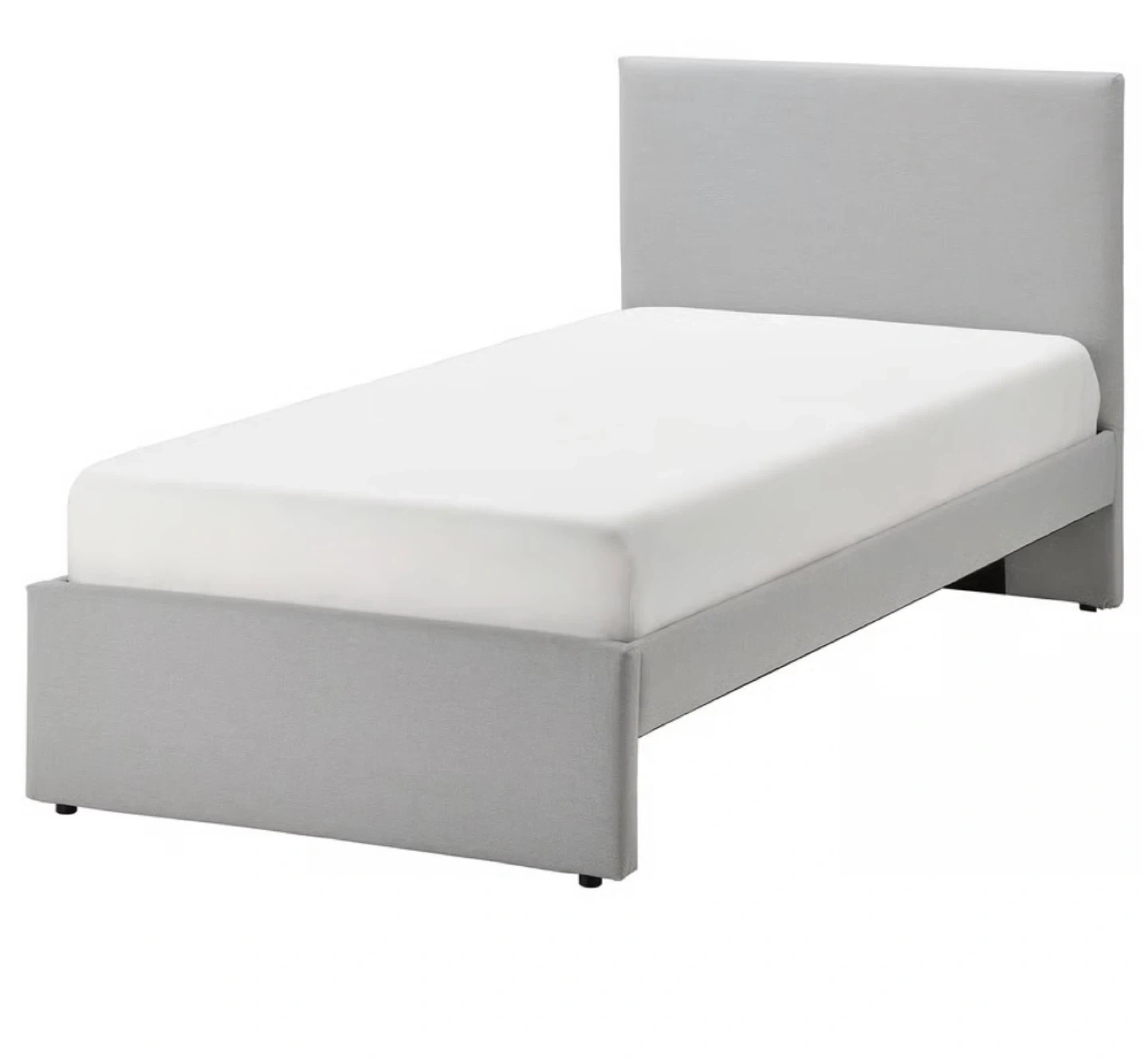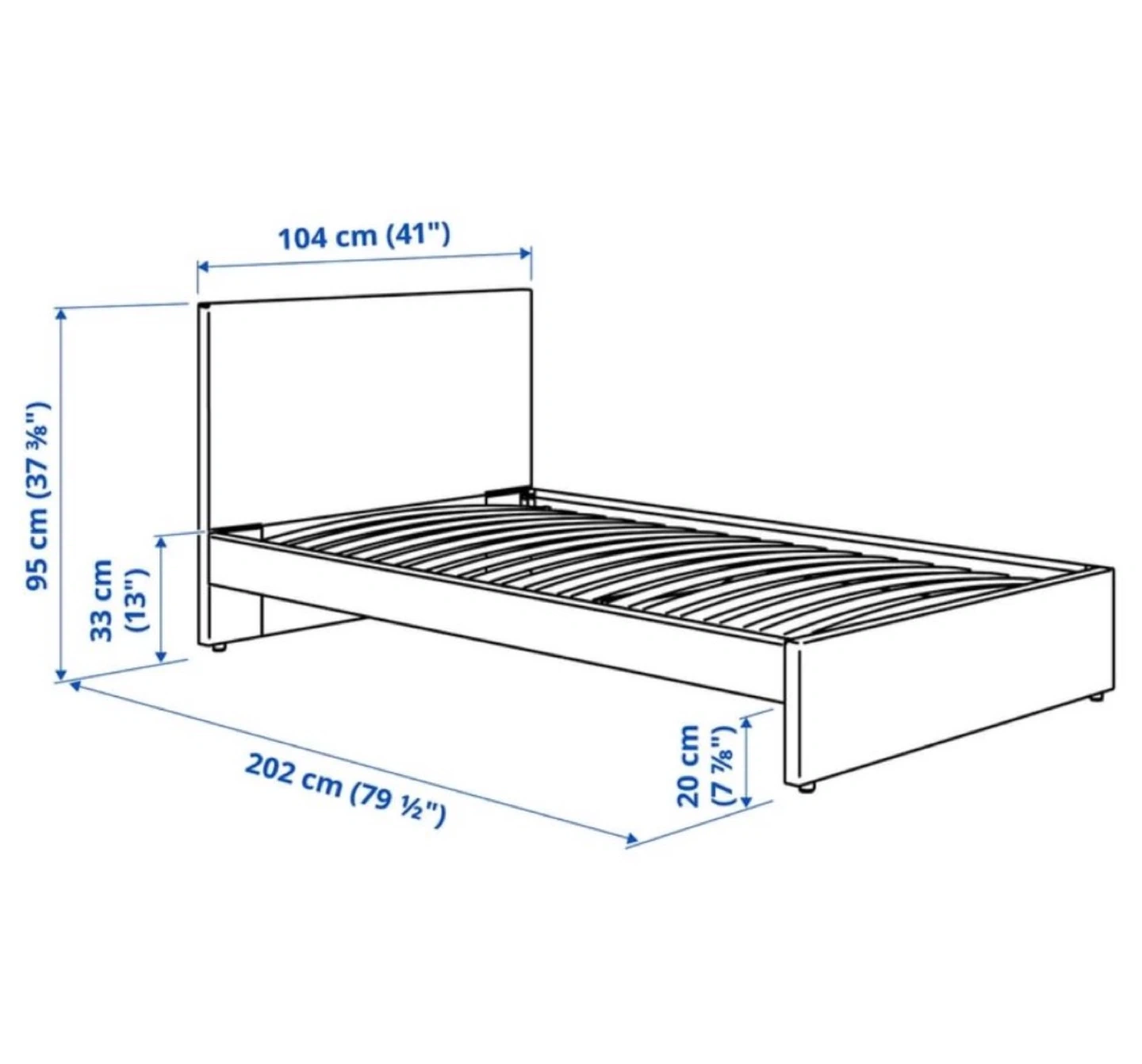 Selling a single bed frame. The bed frame is gray and measures 41" wide and 79 1/2" long. The headboard height is 37 3/8". Barely used by visitors in our past place! We moved out and now have only one room!