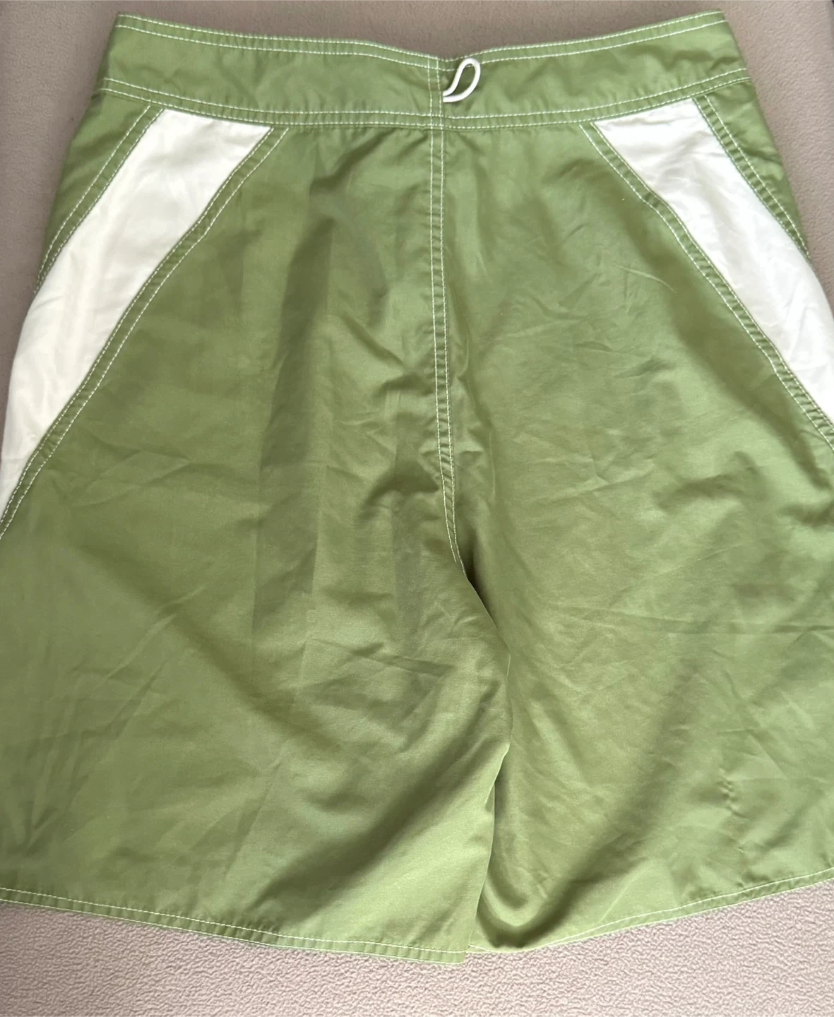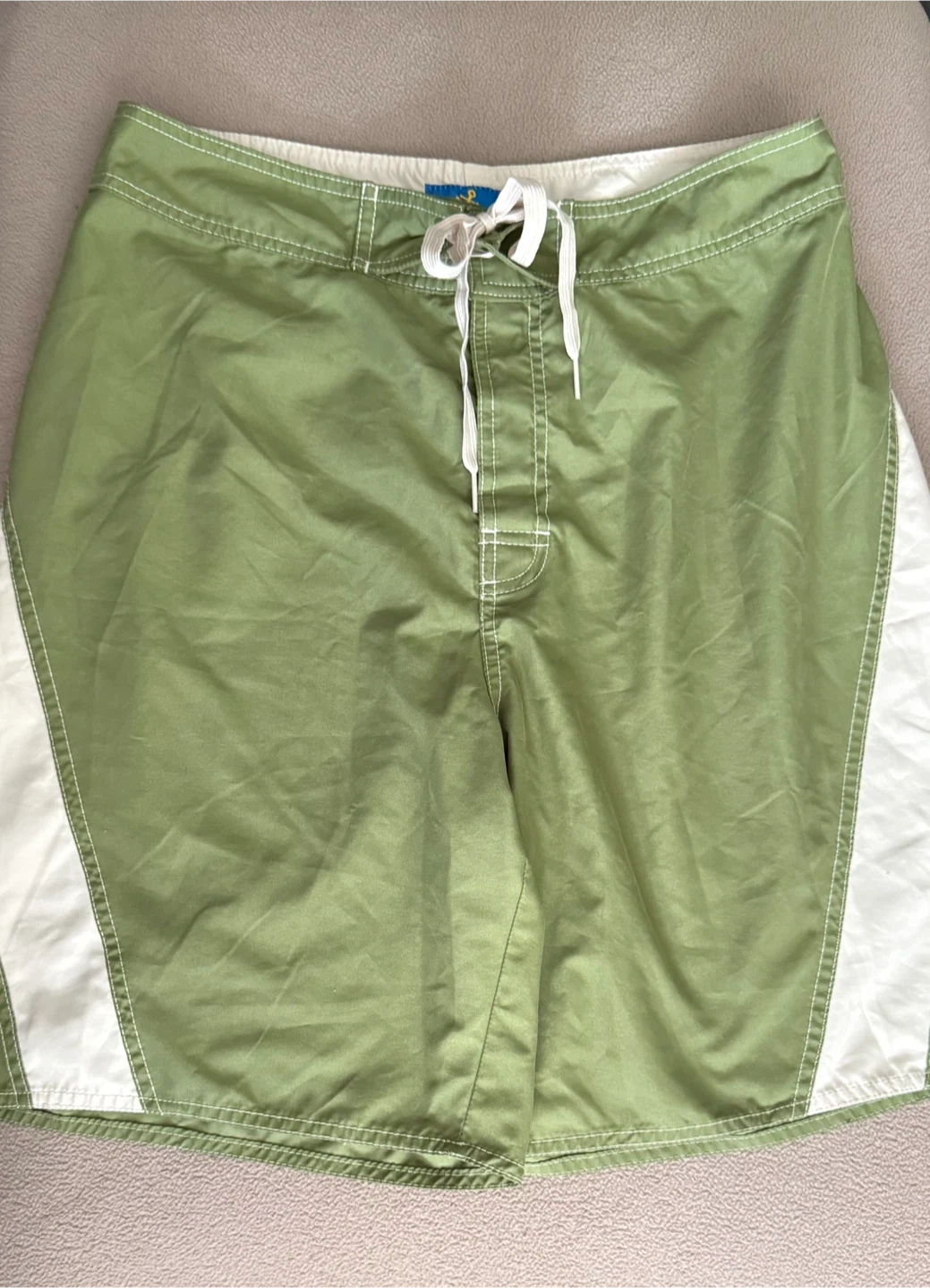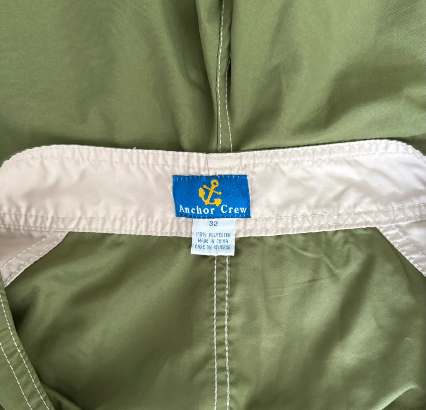 Selling a pair of Anchor Crew board shorts in size 32. They are a light green color with white accents. Made of 100% polyester, perfect for swimming or just hanging out!