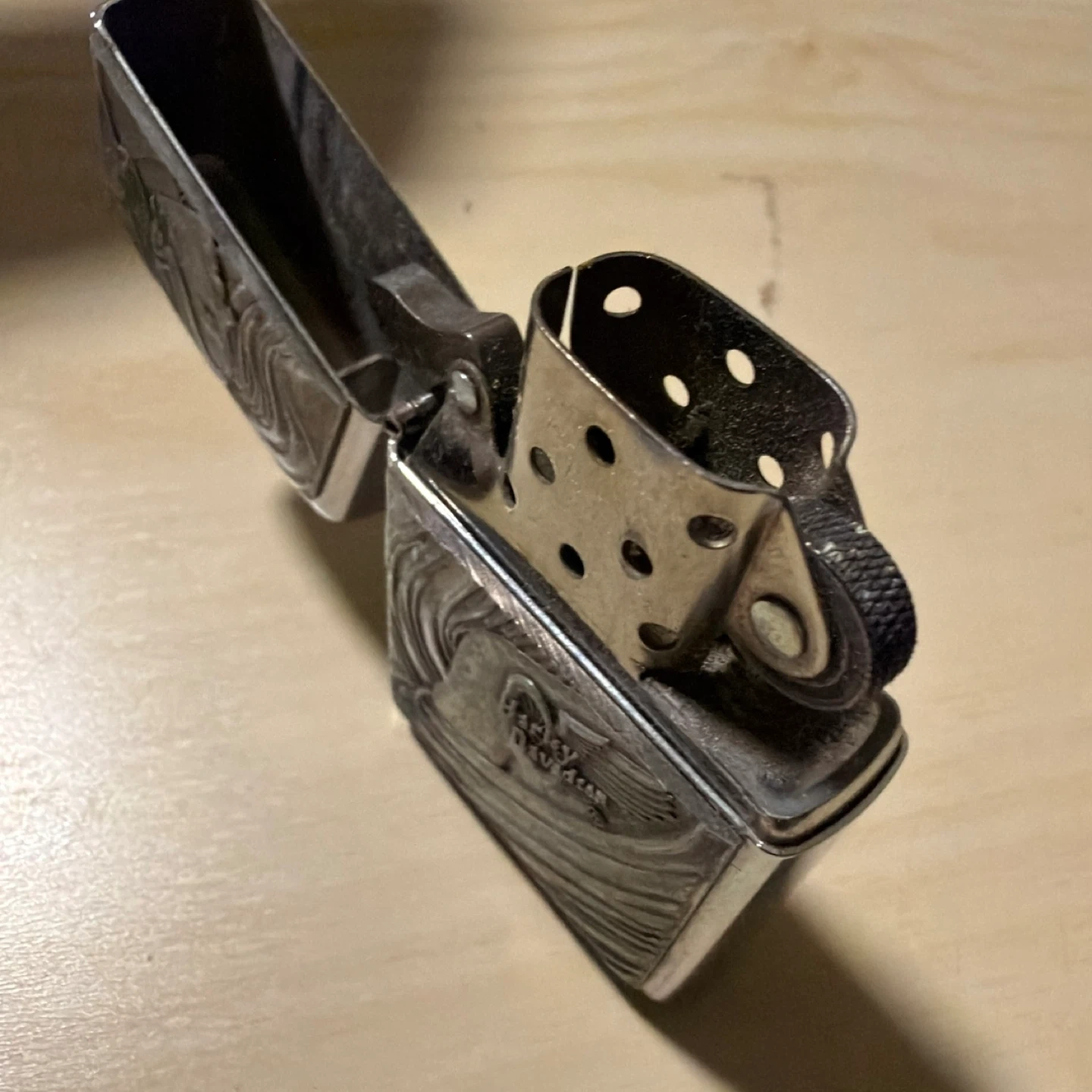 261Selling a Zippo lighter with a Harley Davidson design! The lighter has a silver color and shows a woman with the Harley Davidson logo on her back. It's in used condition.