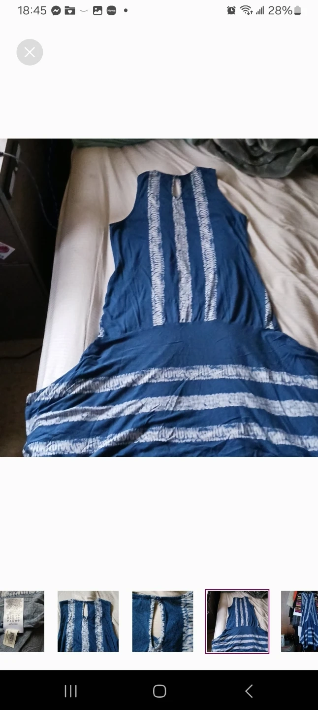 This is a BCBGMAXAZRIA dress in size XXS. It's a beautiful blue and white color. The material is 60% cotton and 40% modal. It's machine washable, cold, non-chlorine bleach only when needed, and tumble dry low. A great dress for spring or summer!
