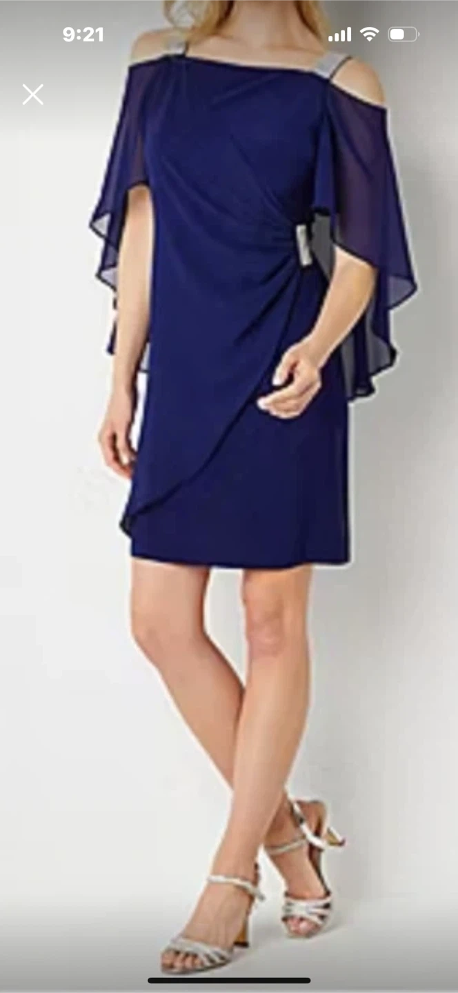 I have a navy blue dress for sale! It's a size Large and in great condition. The dress features an elegant design with layered chiffon sleeves and rhinestone accents on the straps and waist. Perfect for a special occasion!