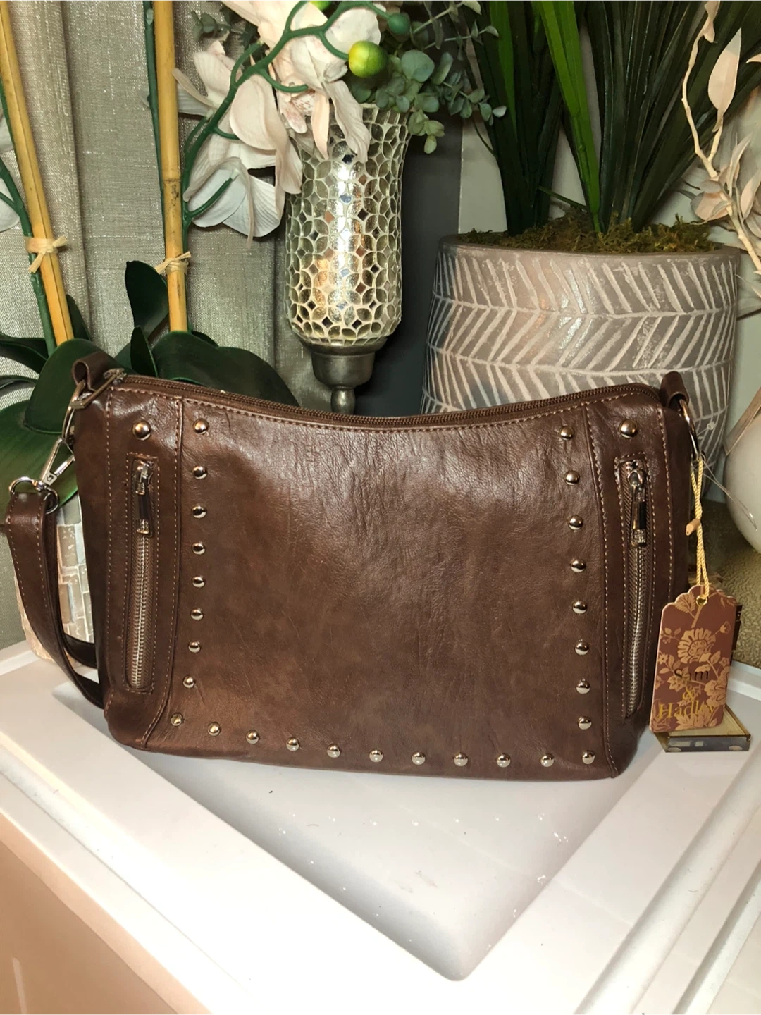 This is a gently used Brahmin brown leather shoulder bag. It has a zipper closure and a long shoulder strap. The bag is in good condition and has a stylish design with silver stud accents.