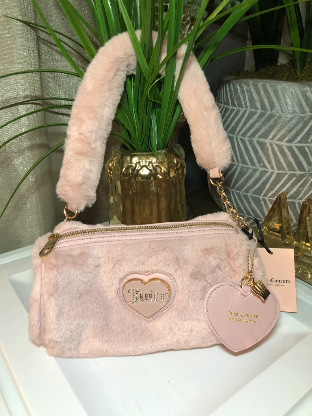 Super cute Juicy Couture shoulder bag in a soft pink faux fur! It's got a heart detail on the front and a heart-shaped charm hanging off the side. Perfect for adding a touch of Y2K flair to any outfit
