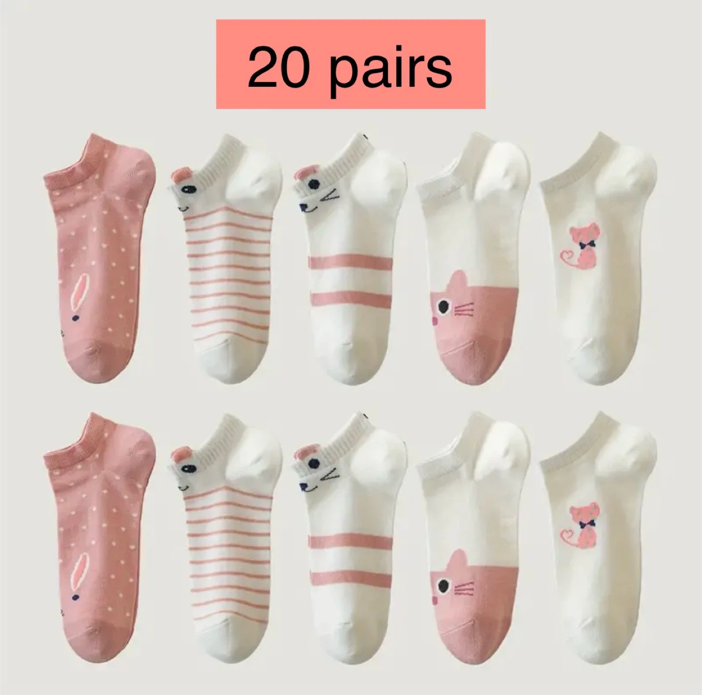 Selling a set of 20 pairs of adorable ankle socks! These socks come in a variety of cute designs, including polka dots, stripes, and animal faces. They're perfect for adding a touch of fun to any outfit