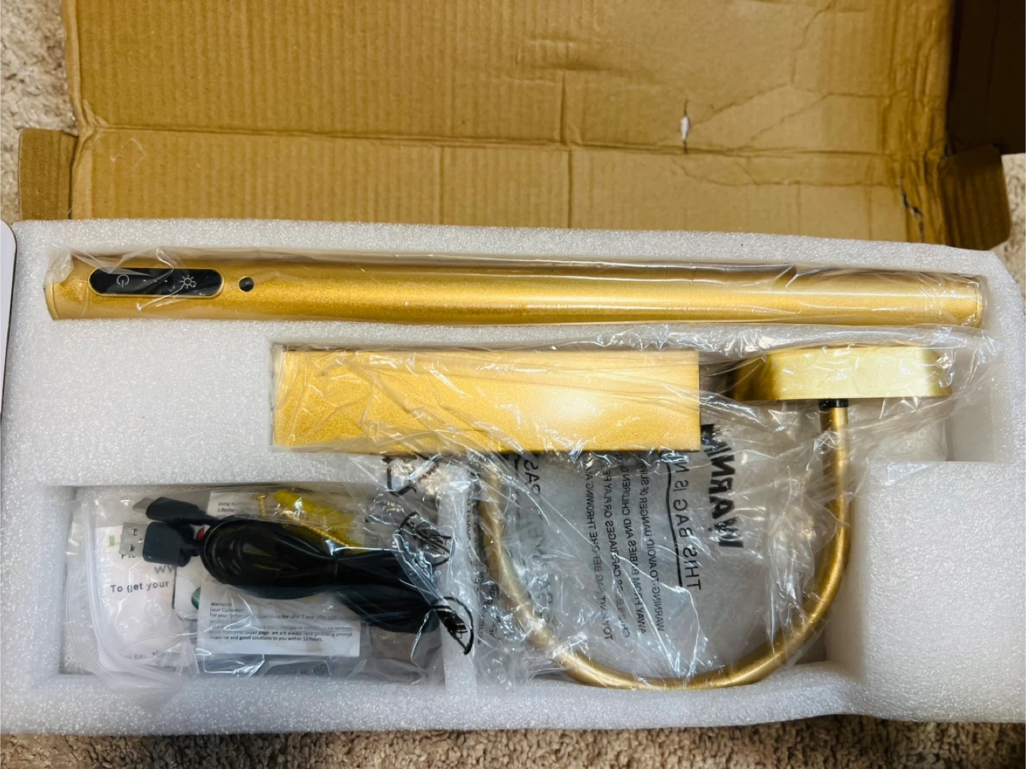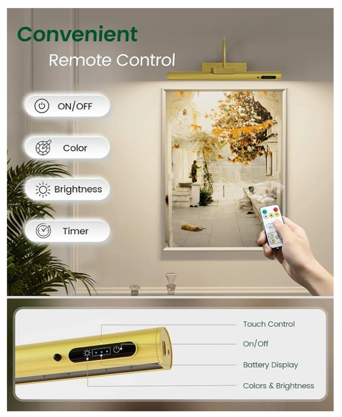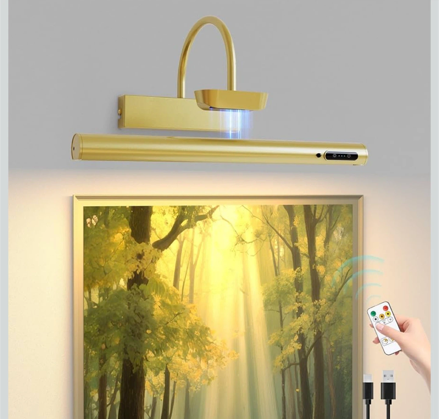This is a gold picture light that comes with a convenient remote control. You can easily control the on/off function, color, and brightness. It also has a timer function. The light has a touch interface, battery display, and adjustable colors and brightness. Includes a USB cable