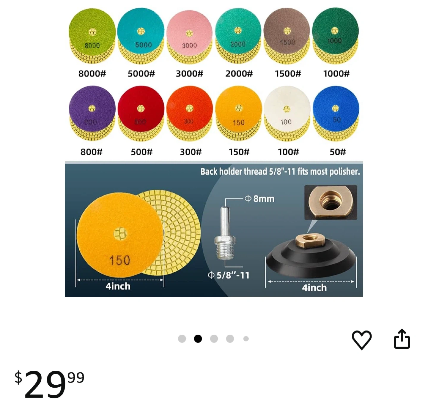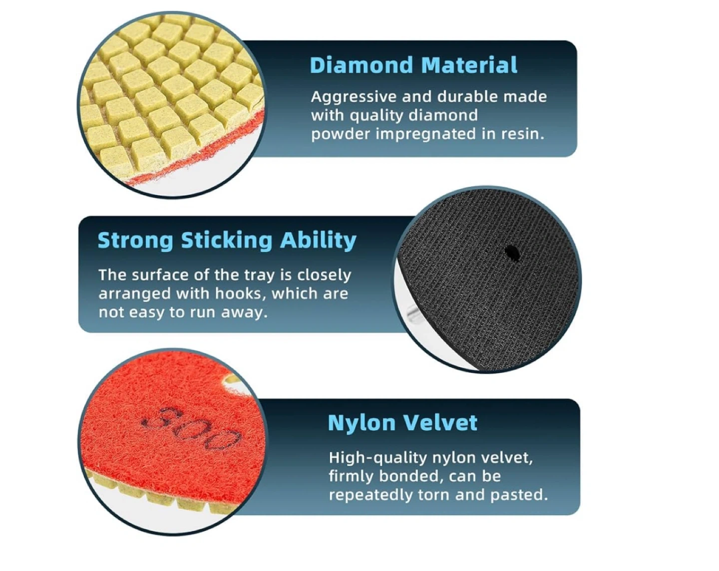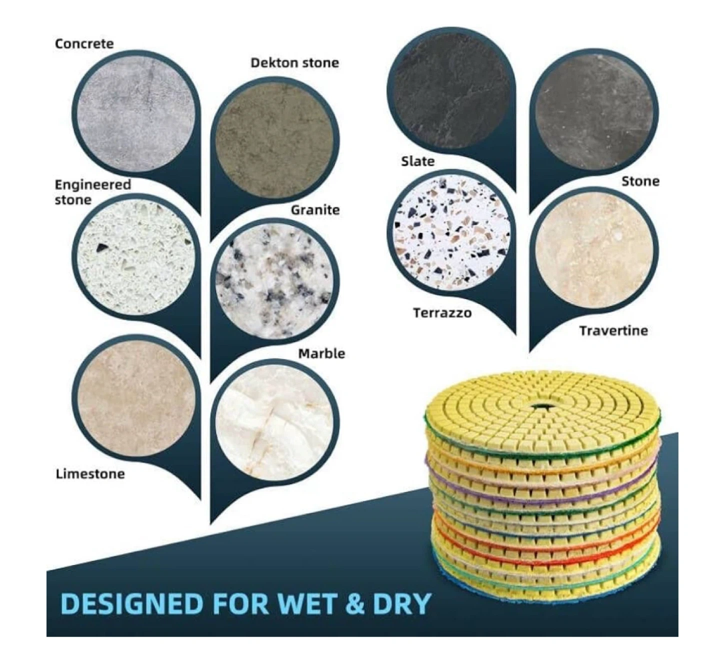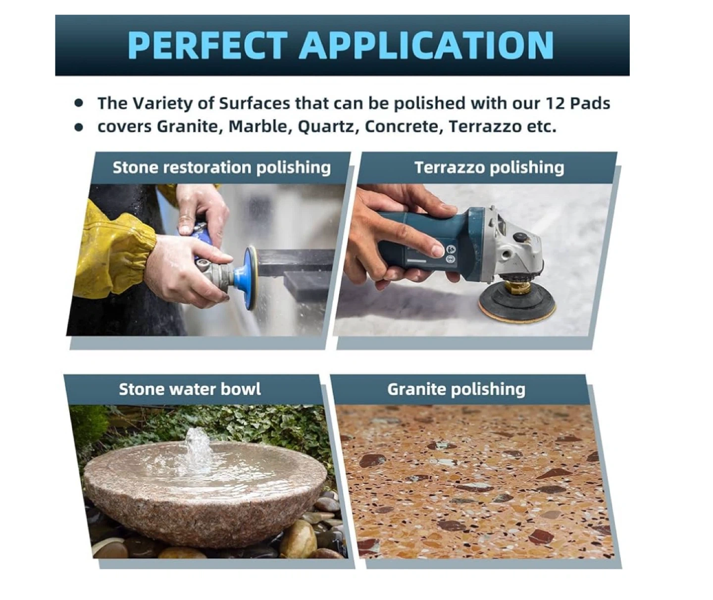 121Get your stone surfaces looking their best with this set of 4-inch diamond polishing pads! Designed for both wet and dry use, these pads are perfect for polishing granite, marble, quartz, concrete, terrazzo, and more. The variety of surfaces that can be polished with these 12 pads covers a wide range of materials. Made with diamond material for aggressive and durable polishing, and nylon velvet for strong sticking ability, these pads are a great addition to your polishing toolkit
