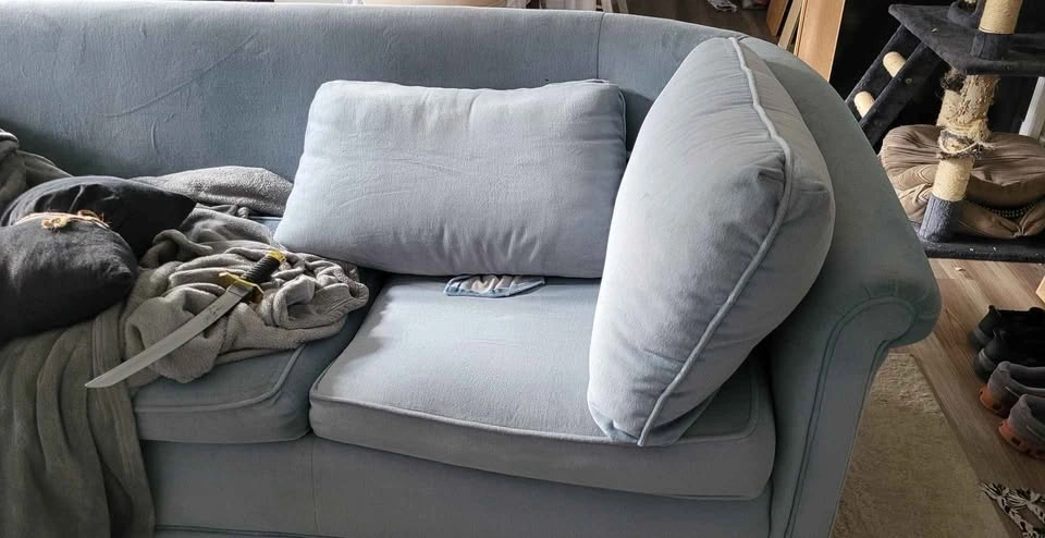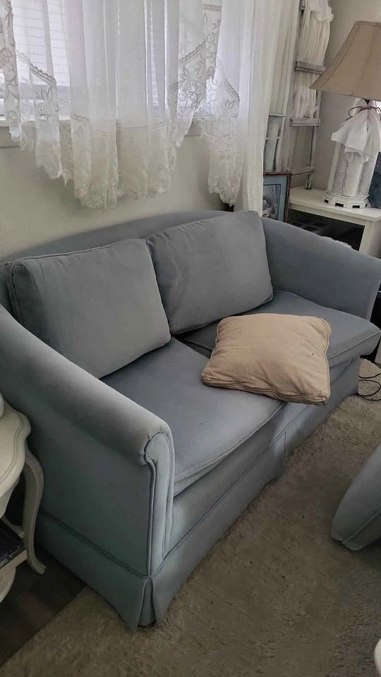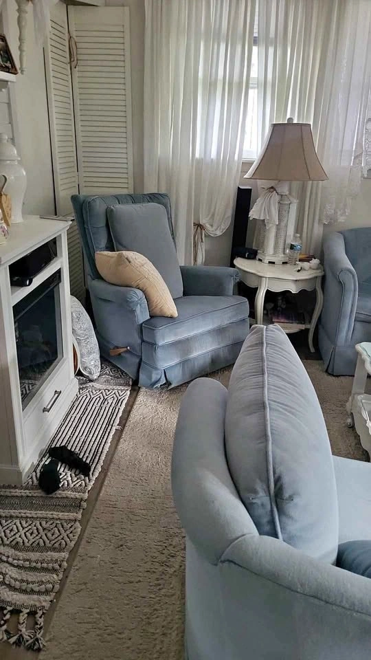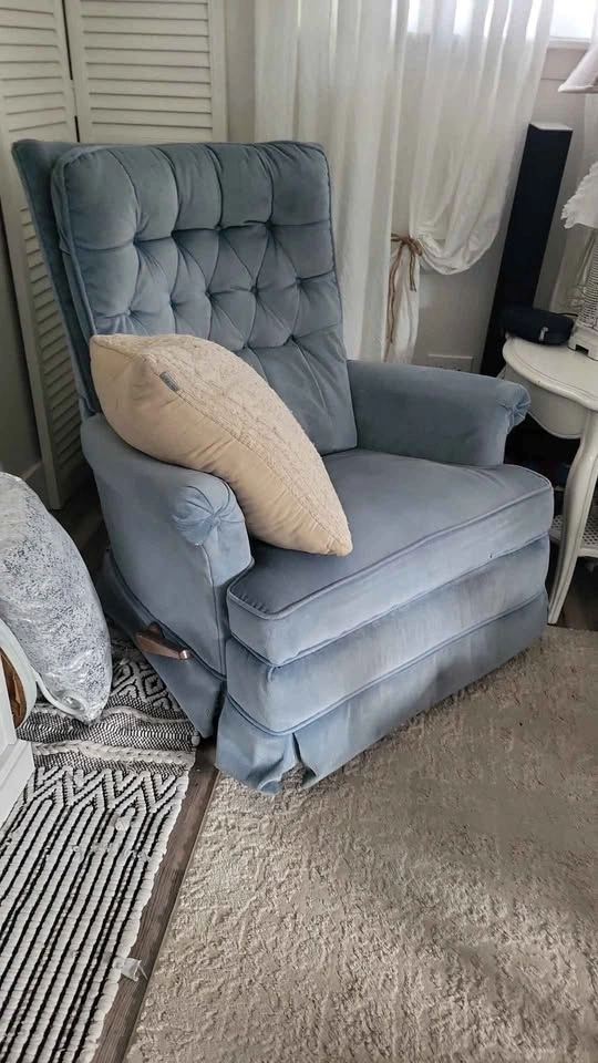 10Beautiful custom living room set in sky blue velvet. It includes 3 pieces: a sofa, loveseat, and reclining rocking chair. In excellent condition. Located in Alsip. Only cash.