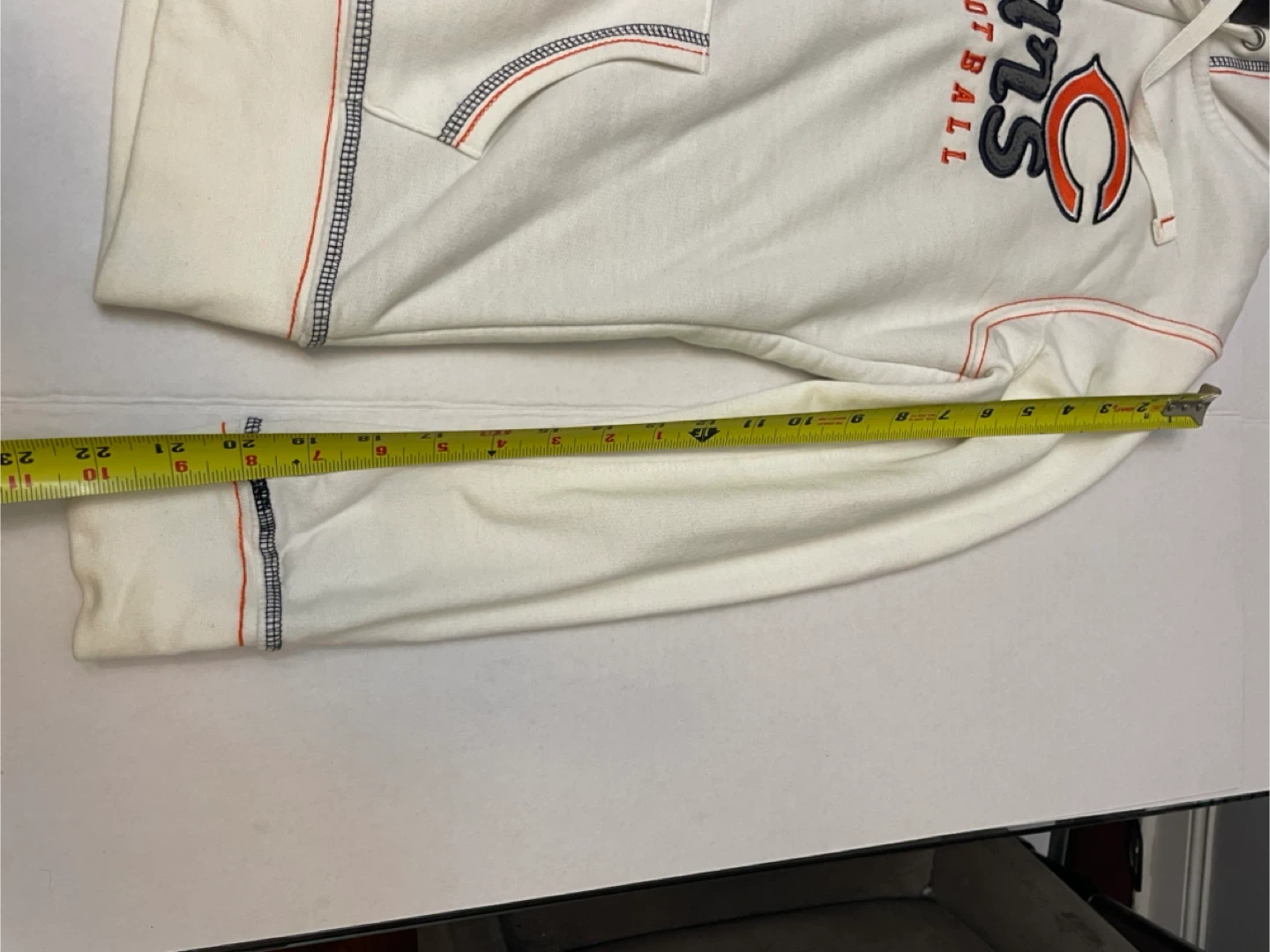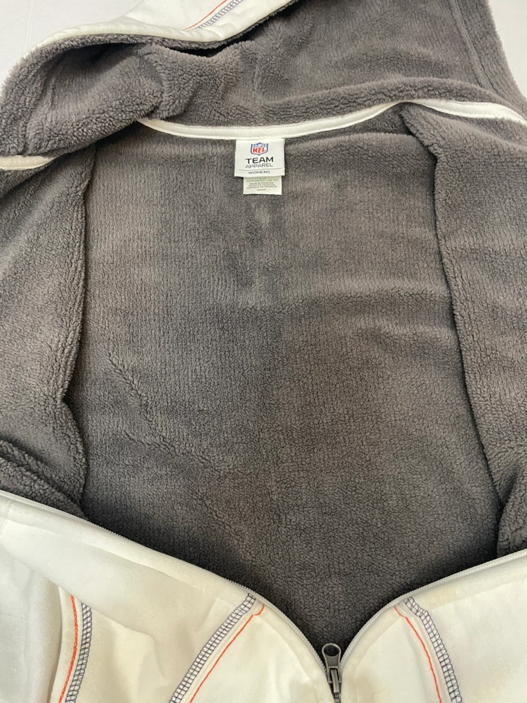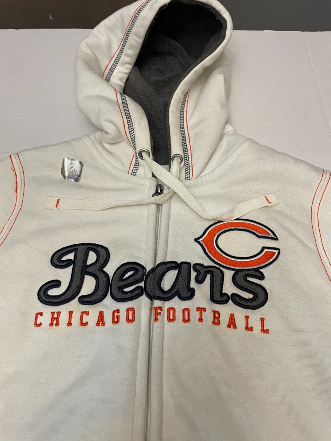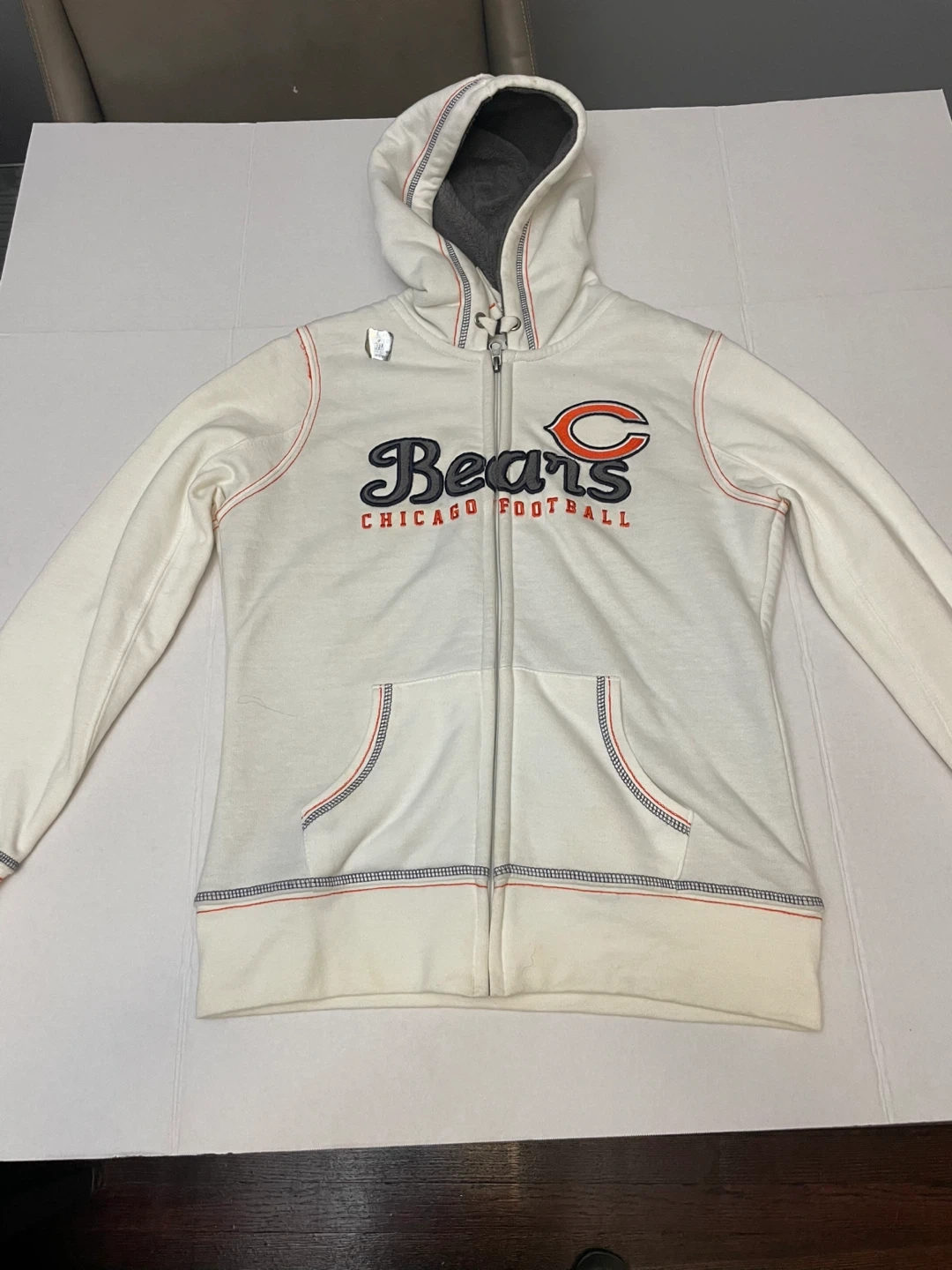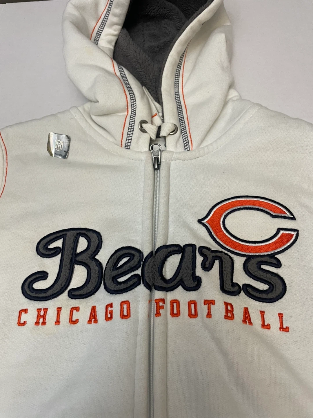 Show your team spirit with this Chicago Bears full-zip hoodie! It's a white/cream color with the Bears logo prominently displayed. Perfect for staying warm while supporting your favorite team!