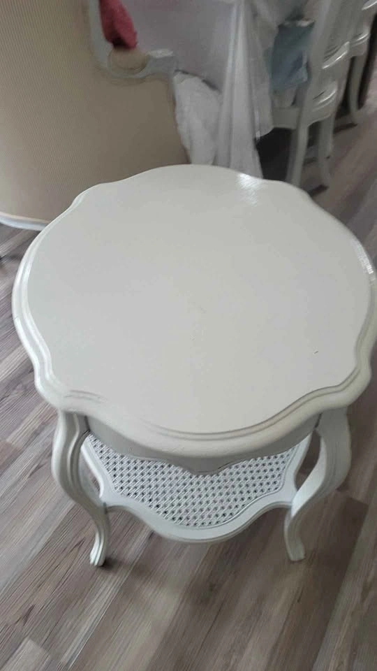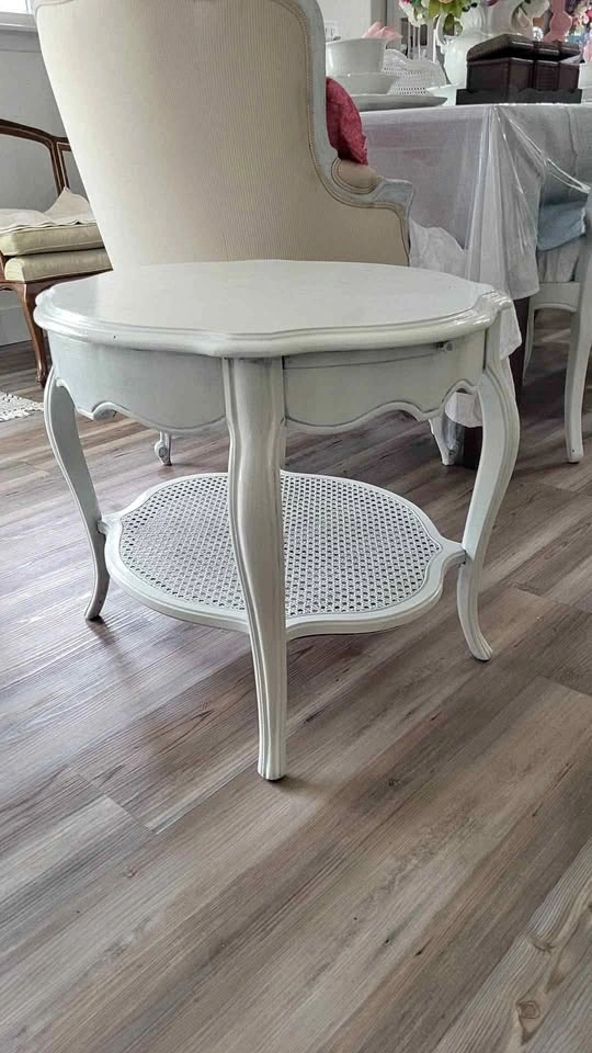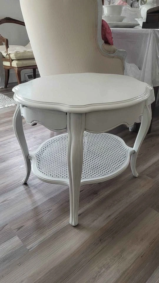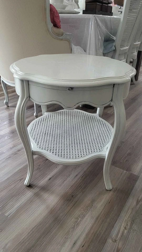 10Hermosa mesa de lado shabby chic estilo frances de pura madera, con caña en la parte inferior. Retocada en hermoso color off white.. Aproximadamente 27" l × 23" w. 22 " h. $75 Sólo efectivo, localizado en Alsip. Más artículos en mi perfil.