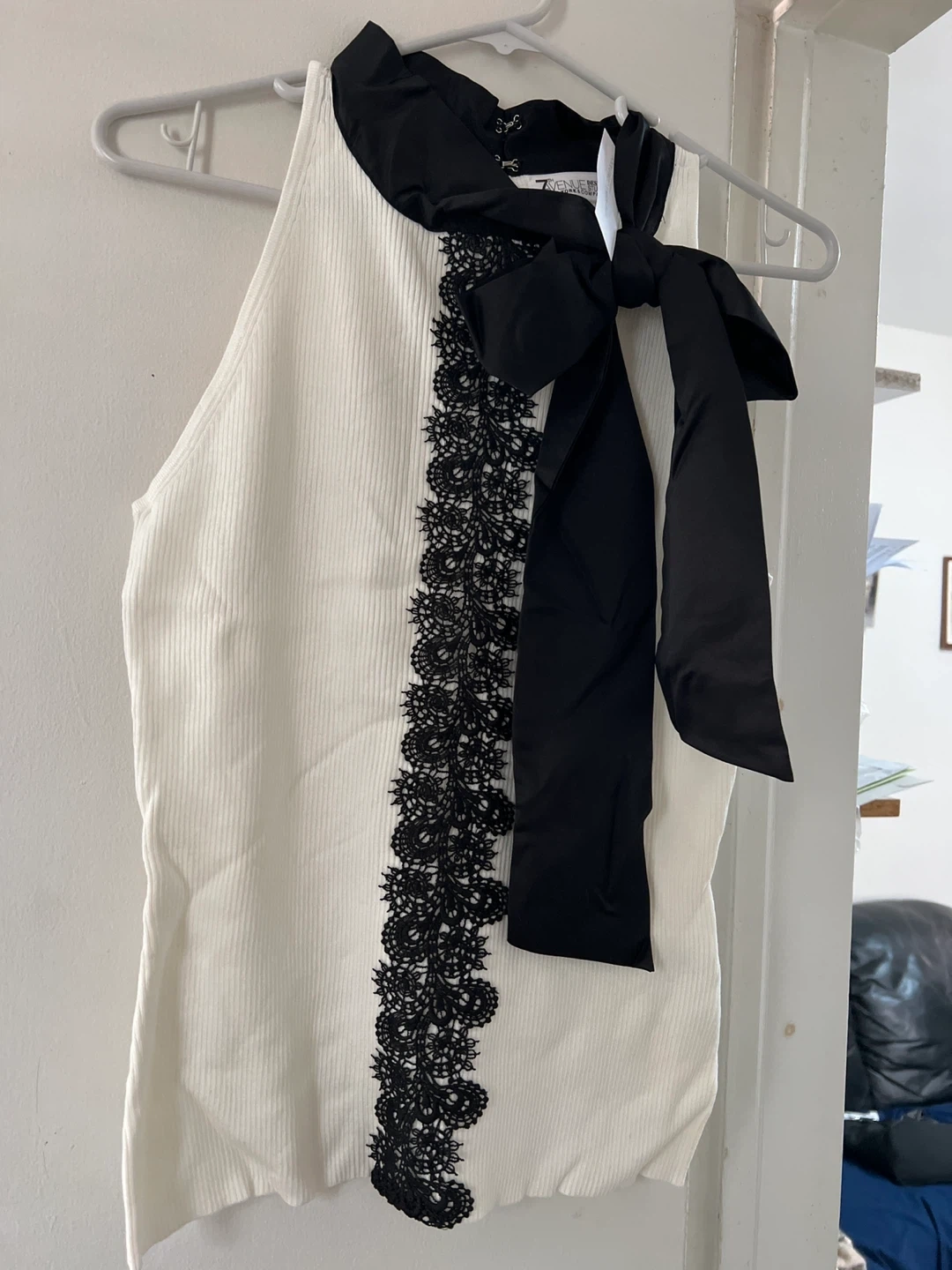 Selling a 7th Avenue Design Studio sleeveless top. It's a cream color with a black lace detail and a large black bow at the neck. Perfect for dressing up or down!