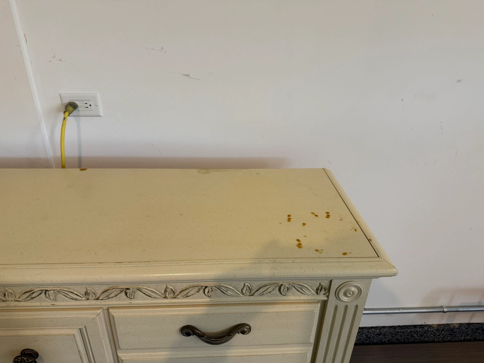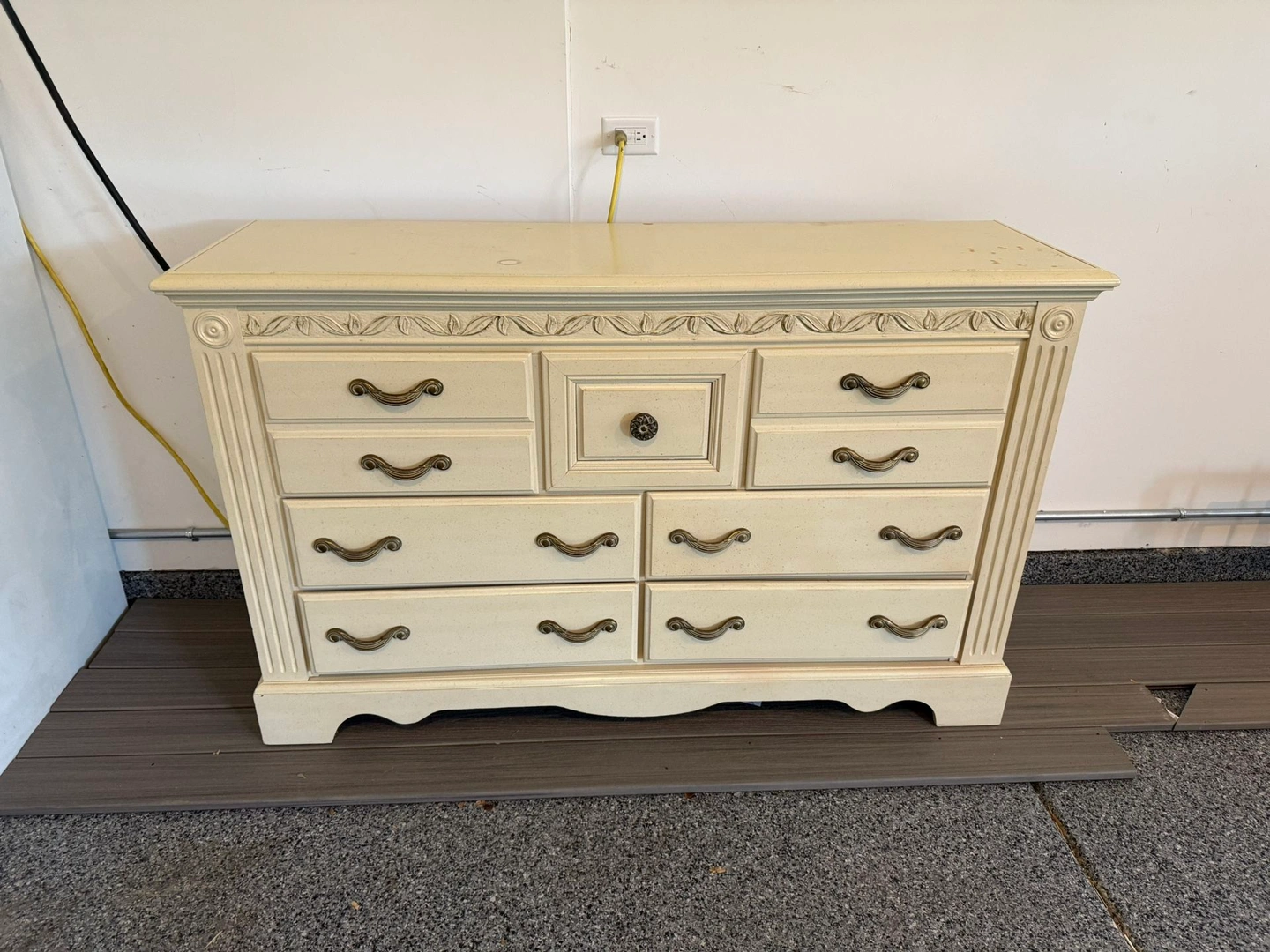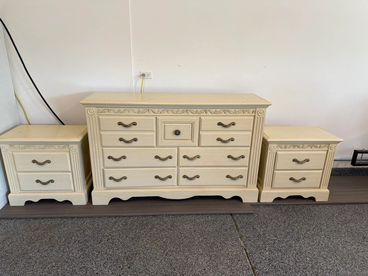 10Queen Size Bedroom Set. Includes Headboard, Footboard, and Rails. Complete with Dresser and Two Nightstands. Solid Wood. All Drawers Fully Functional. The Dresser is 62” x 18”. Nightstands are 28” x 16”