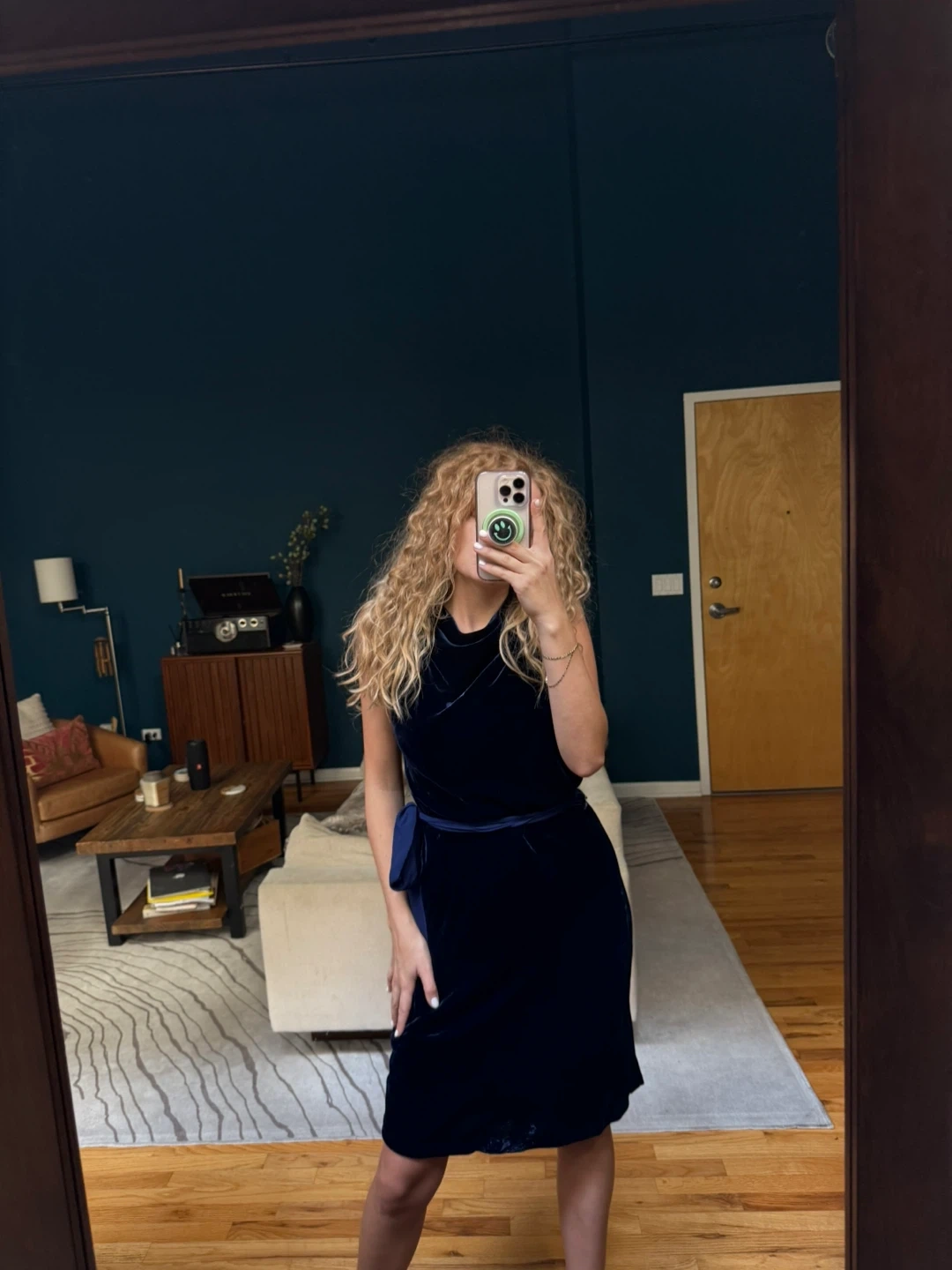 Selling a beautiful velvet dress in navy blue. It's in great condition and features a flattering silhouette. The material is soft and luxurious, perfect for a special occasion or a night out!