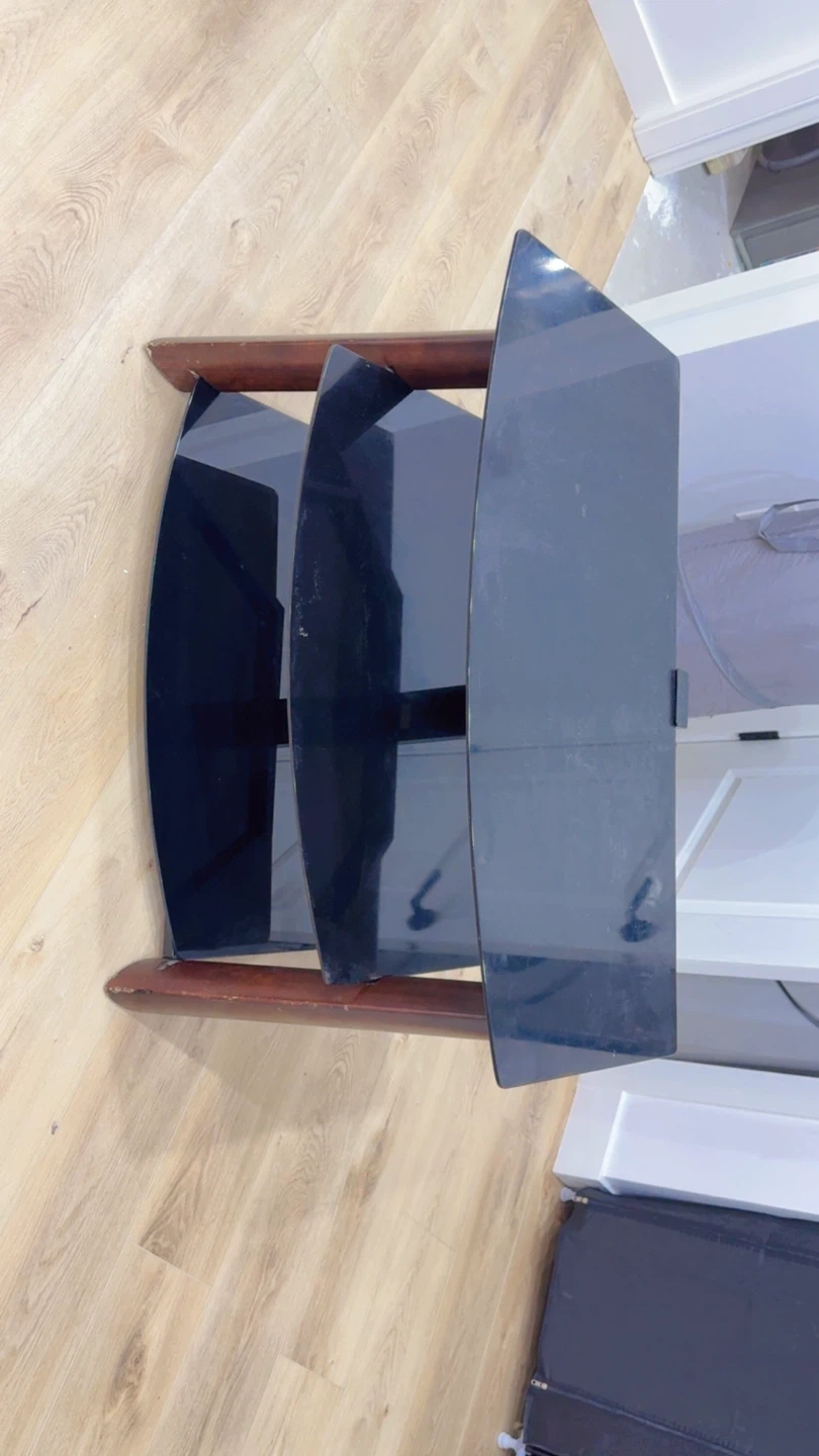 Selling a sleek black glass TV stand. It's in great shape and would look perfect in any living room. It features three shelves, providing ample space for your media devices and accessories. The dark wood legs add a touch of elegance to the design