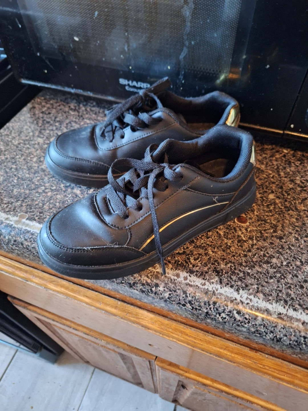 68Selling a pair of black sneakers. They are used, but still have a lot of life left in them! They have black laces and a gold stripe on the side.