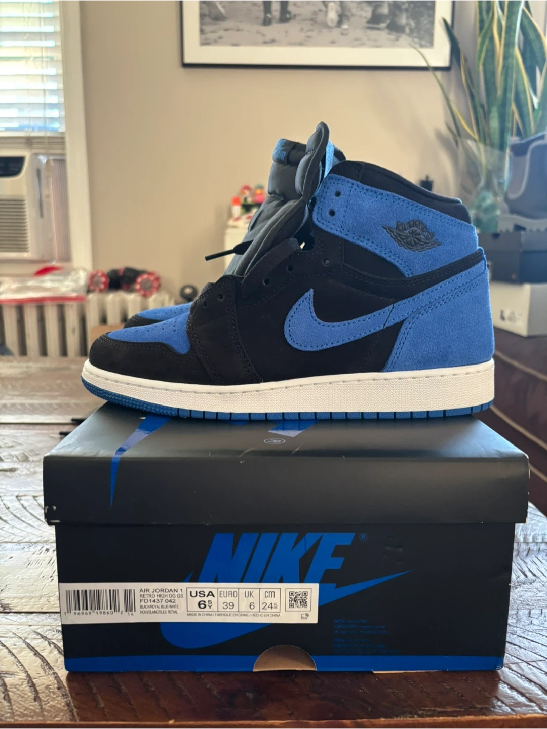 Selling a pair of Nike Air Jordan 1 Retro High Hyper Royal sneakers in size 6.5 US. These shoes feature a stylish black and blue colorway. They are brand new and come with the original box. Great for any sneaker enthusiast!