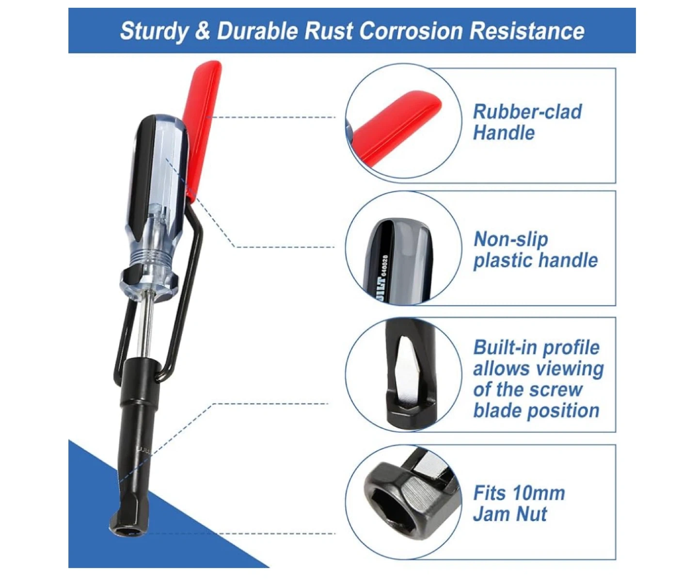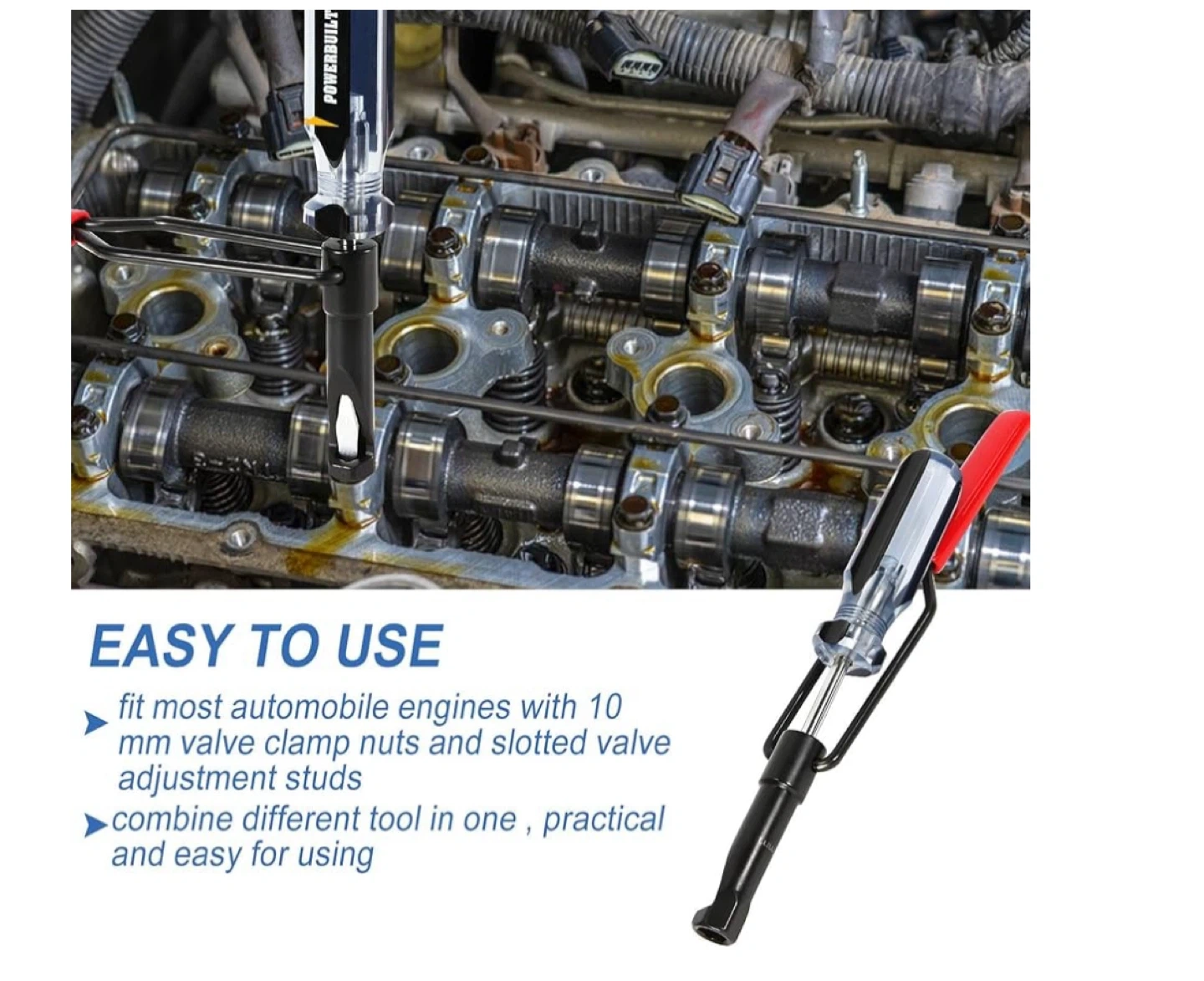 121This Powerbuilt valve adjusting tool is designed for most automobile engines with 10 mm valve clamp adjustment studs and slotted valve adjustment studs. It combines different tools into one, making it practical and easy to use. It also fits 10mm jam nuts. Originally bought for $19.98 Compatibility: compatible with Honda/VTEC/Toyota/Nissan/Mazda and other Japanese automobile engines valve lash adjustment, and valves with 10mm clamp nuts and slotted valve adjustment studs Fits valves with 10mm jam nut and slotted valve adjusting stud Easy to Use: check the position of the valve studs, use the valve adjustment tool to aim at the valve studs, check the side profile to see if the screwdriver blade is properly engaged