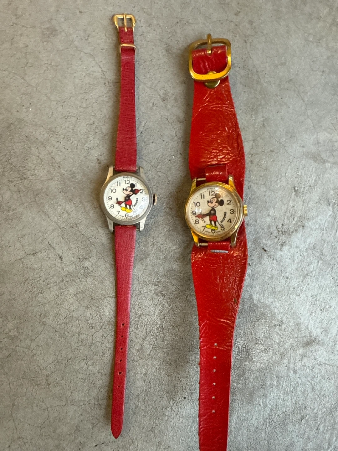 10Selling a set of two vintage Mickey Mouse watches! Both have red straps and Mickey Mouse on the face. They're in good condition for their age and would be perfect for a collector or Disney enthusiast
