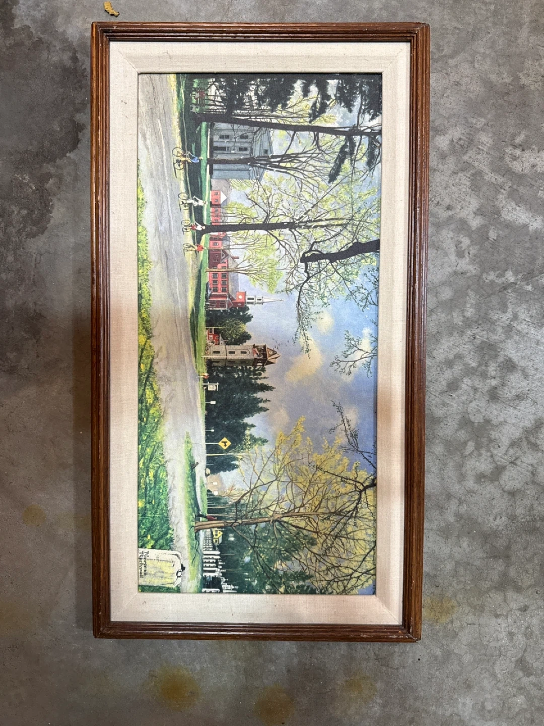 10Selling a framed print of a Norman Rockwell painting. It's in good condition and ready to hang in your home or office. The frame is a dark wood tone with a neutral-colored matting that complements the artwork nicely