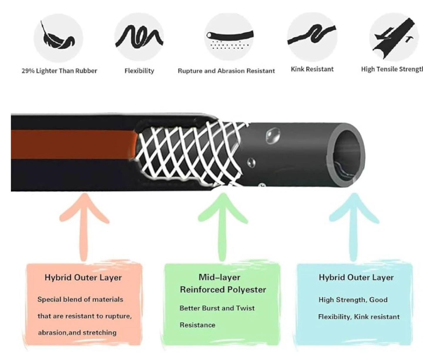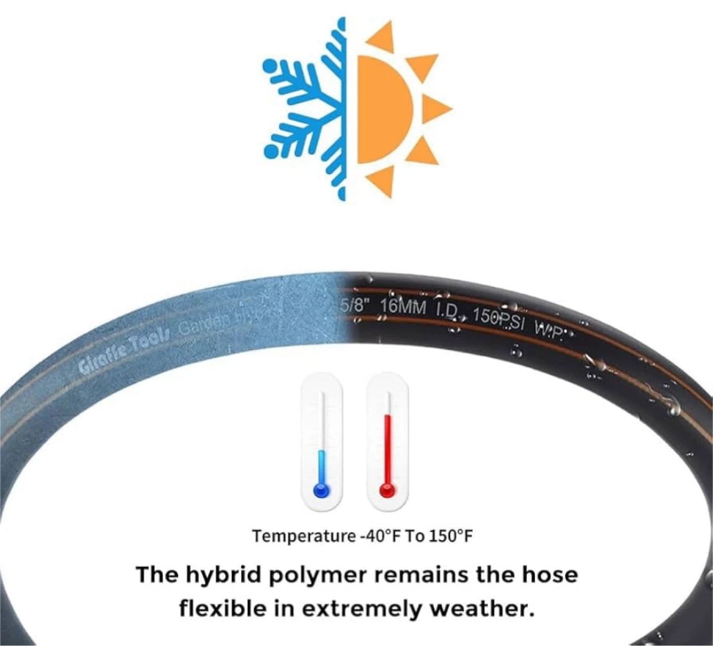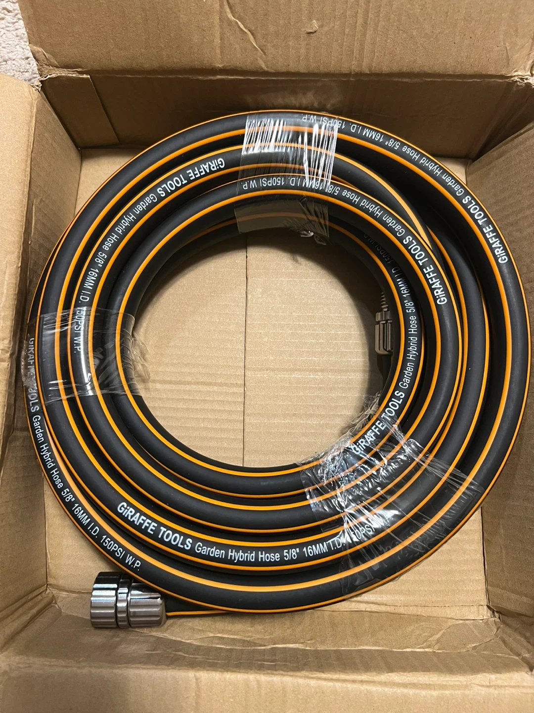 121This Giraffe Tools garden hose is 5/8" and made with a hybrid polymer that remains flexible in extremely weather. It features a full interface with a nickel-plated male connector to prevent corrosion or wear. The female connector has an inside washer to prevent leakage. It's also 29% lighter than rubber, rupture and abrasion resistant, kink resistant, and has high tensile strength