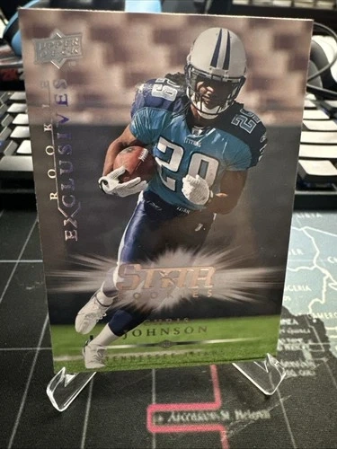 652008 Upper Deck Rookie Exclusives trading card featuring Chris Johnson of the Tennessee Titans. This sports trading card is part of the base set for football collectors and showcases the rookie season of the player. Manufactured by Upper Deck, the card is a valuable addition for fans of the National Football League looking to add to their collection.