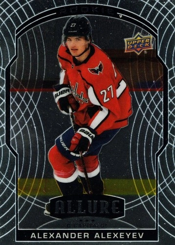 652020-21 UD Allure Alexander Alexeyev ROOKIE #86 trading card featuring the player from the Washington Capitals in the National Hockey League (NHL). Manufactured by Upper Deck, this original single sports trading card is a short print insert specifically tailored for ice hockey fans. With the Rookie designation, this card showcases the up-and-coming talent of Alexander Alexeyev, making it a desirable collectible for enthusiasts of the sport.