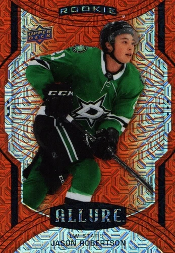 65For all the Ice Hockey fans out there, here is a chance to add a rare 2020-21 Upper Deck ALLURE sports trading card of Dallas Stars' player Jason Robertson to your collection. This Rookie card comes in the Orange Slice variety and is manufactured by Upper Deck, one of the most renowned names in the industry. The card is in excellent shape and is a must-have for any NHL or Robertson fan. The card features Robertson in his Dallas Stars' jersey and is perfect for framing or displaying. It is a great addition to any sports trading card collection and is sure to be a conversation starter. Don't miss out on the opportunity to own this rare card.