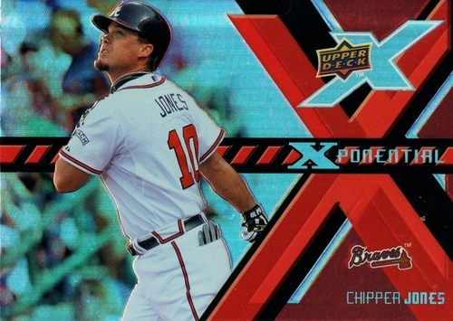 65This is a 2008 Upper Deck X Chipper Jones sports trading card with an Xponential Holo Insert #X-JO. The card features an embossed design and belongs to the Major League Baseball (MLB) league. It is a great addition for Atlanta Braves fans and sports trading card collectors. This card is from the 2008 season and is in near mint condition.