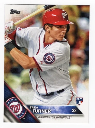 65This 2016 Topps Trea Turner sports trading card is a must-have for any fan of the Washington Nationals or baseball in general. Featuring the rookie player's impressive stats and skills, this card is a perfect addition to any collection. The card number is 103 and it is from the 2016 season. A great find for any collector, this card is part of the 2016 Topps set and is manufactured by Topps. As a sports trading card, it is a valuable item for fans of the sport and the player alike.