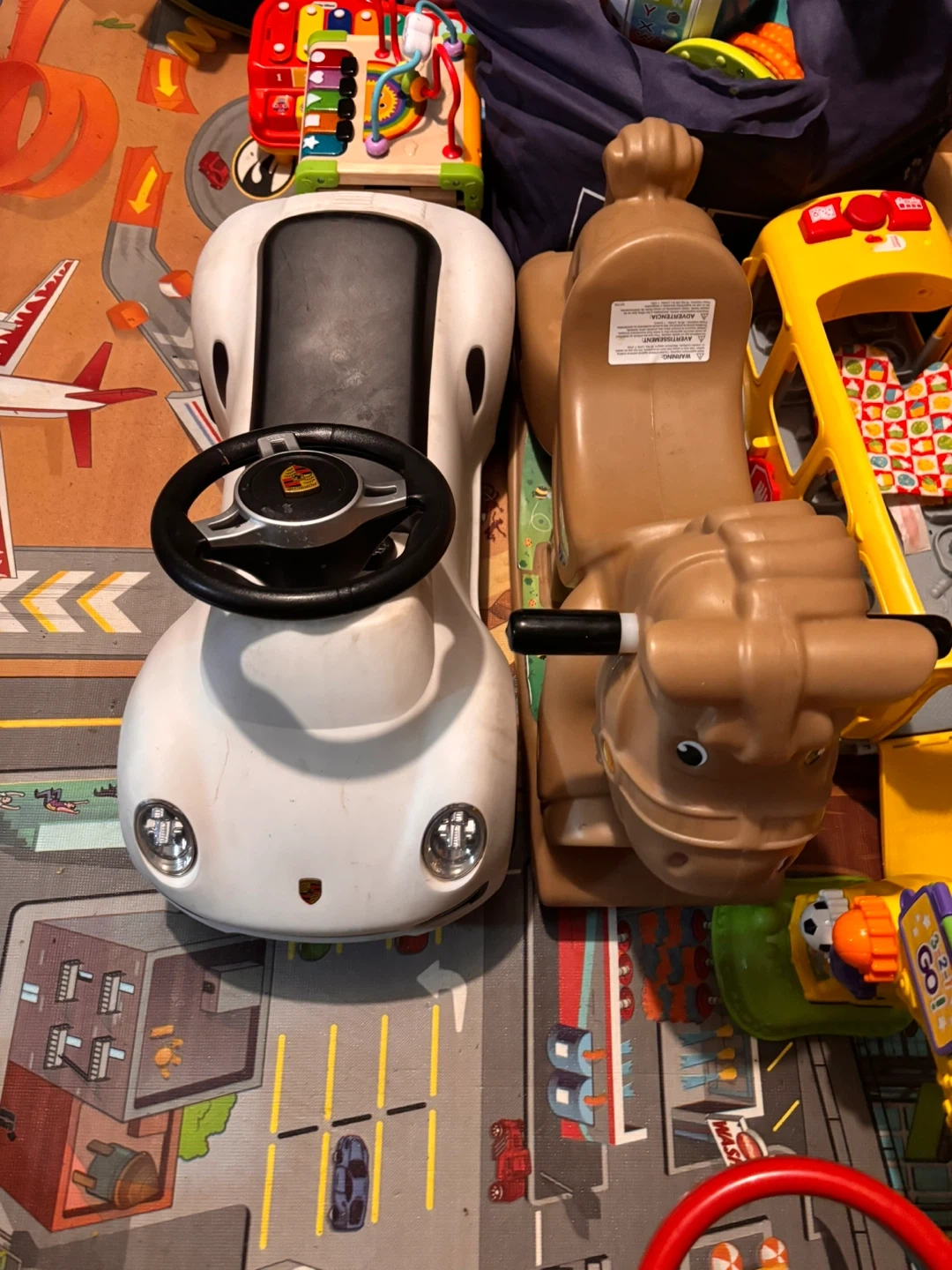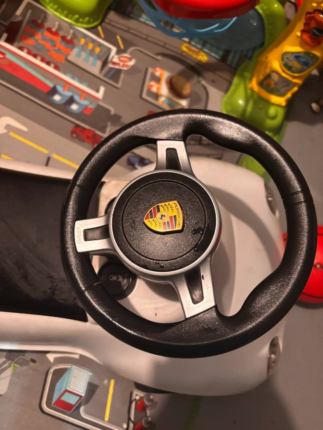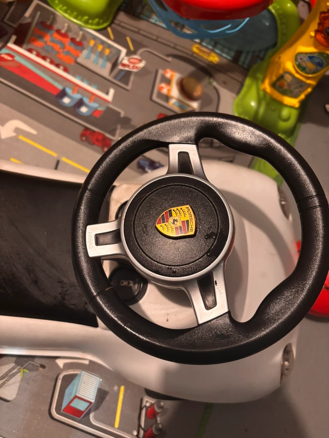 18Selling a white Porsche ride-on car for kids! It has a black seat and steering wheel with the Porsche logo. It's in good condition and ready for a new little driver