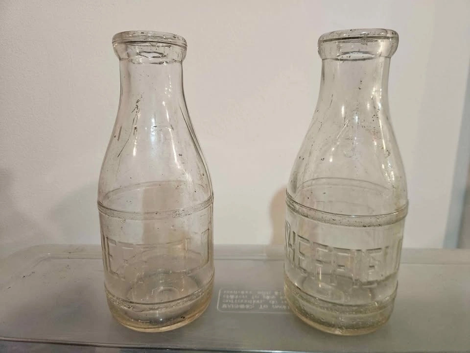 77Antique 1930s Sheffield Farms - Made in USA - New York City Dairy Farm - Vintage Embossed Glass Milk Bottle Item measures 9 1/2 inches tall and 3 3/4 inches in diameter They are 1Qt bottles, I have two of them and price is for each bottle. Any reasonable offer accepted.