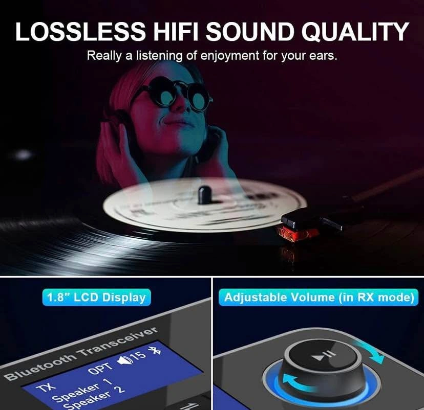 Bluetooth Transmitter Receiver 3-in-1 Bluetooth 5.0 Audio Adapter for 2 Headphones With Bypass Volume Control Low Latency Long Range LCD Display ON/OFF Optical AUX RCA for TV Home Stereo Speaker