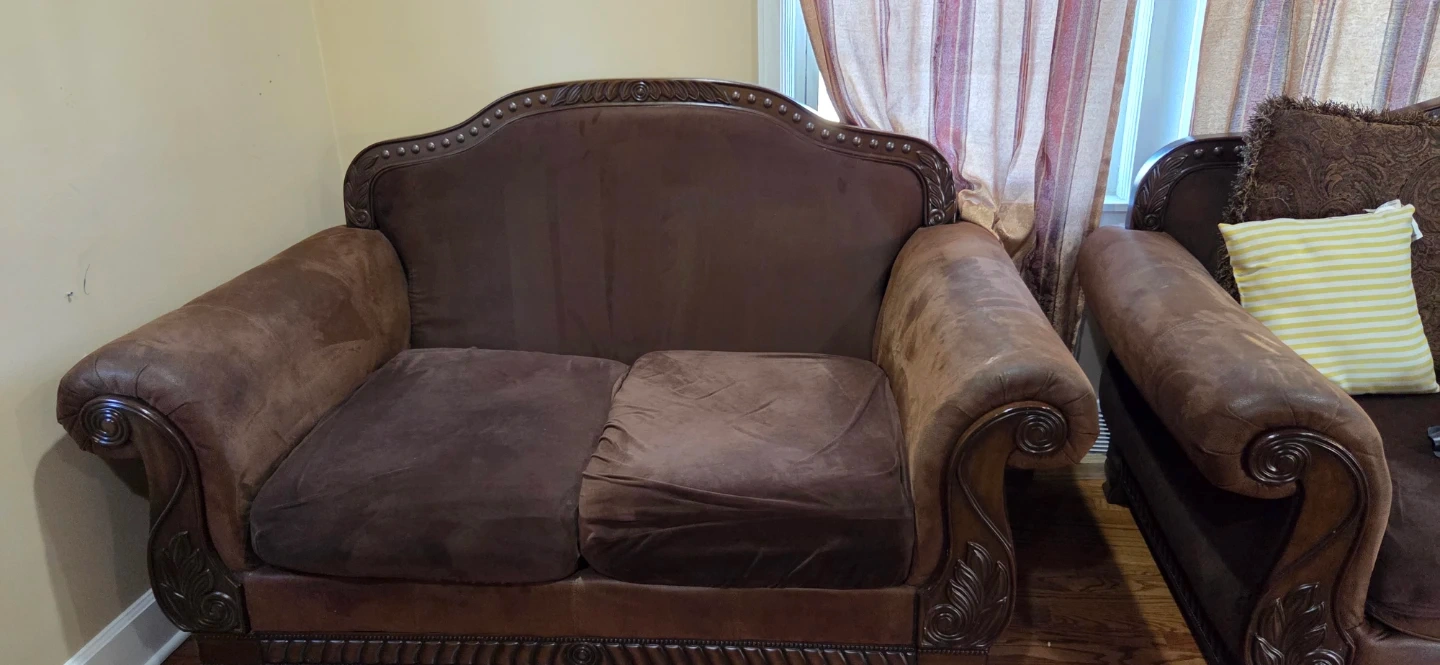 Selling a used brown sofa and loveseat set. They are in good condition and would be a great addition to any living room!There are two sofas. The larger one is 7"2ft long, 3"4ft wide, and 3"4 ft in height. The smaller one is 5"4ft long, 5"5ft wide, and 3"4ft in height. Transportation and We do not provide removal services; the purchaser must arrange their own transportation. Highest offer gets both sofas. I will try my best to match your offer. Let me know as soon as possible if you are interested