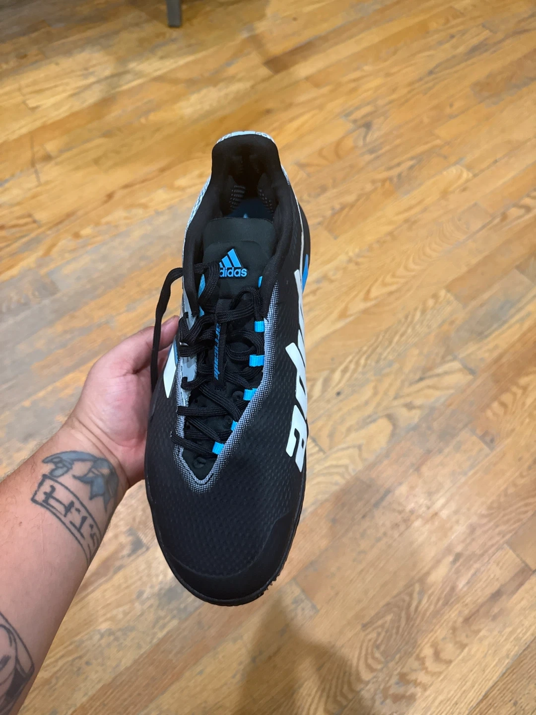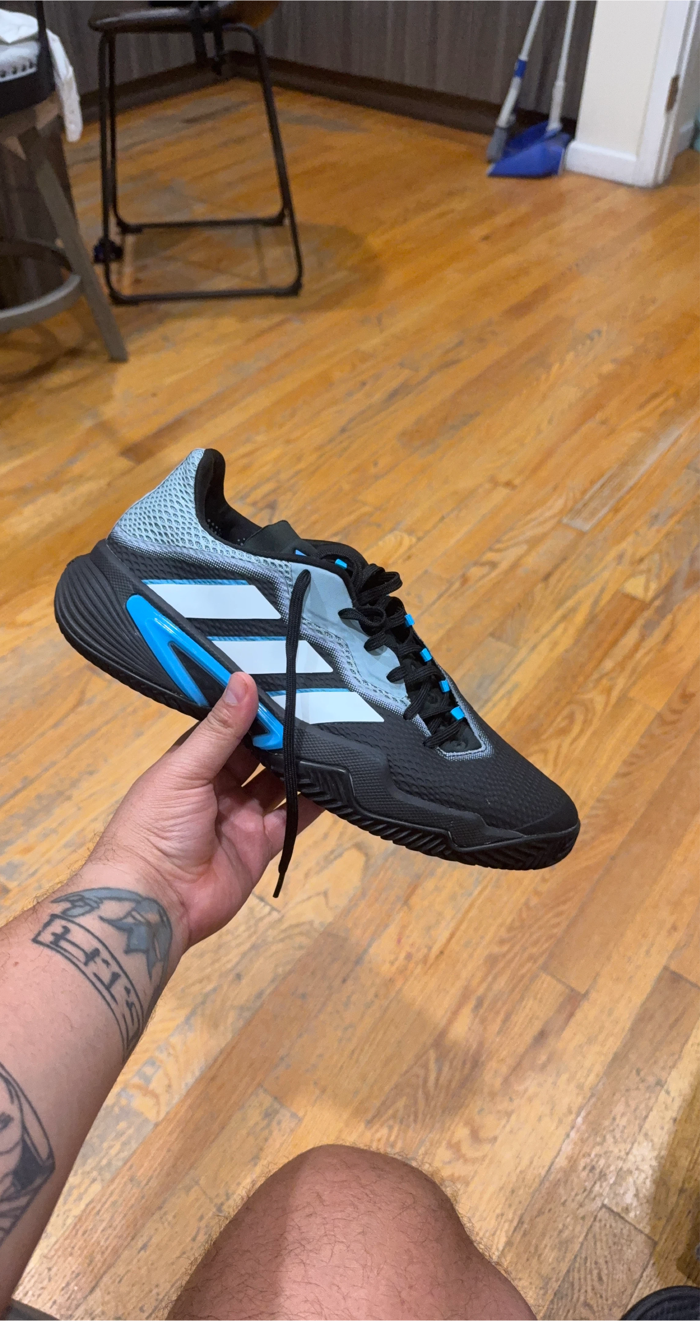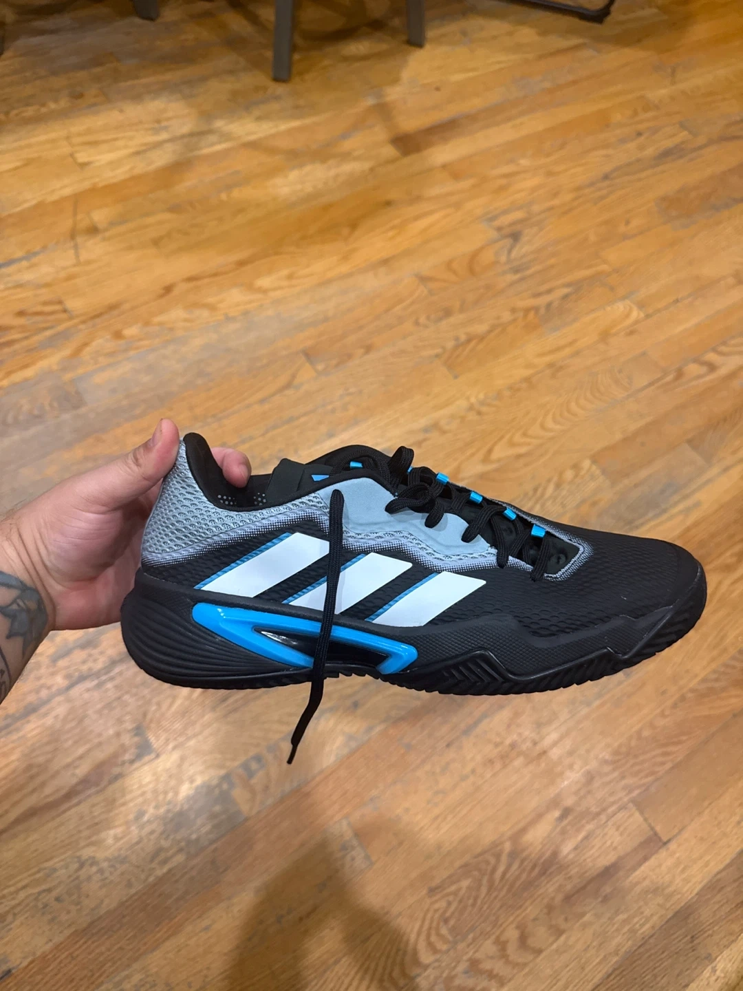 Adidas Barricade M Clay tennis shoes in great condition. These shoes are perfect for clay court tennis and offer excellent support and durability. They feature a sleek design with the iconic Adidas stripes. Check them out!