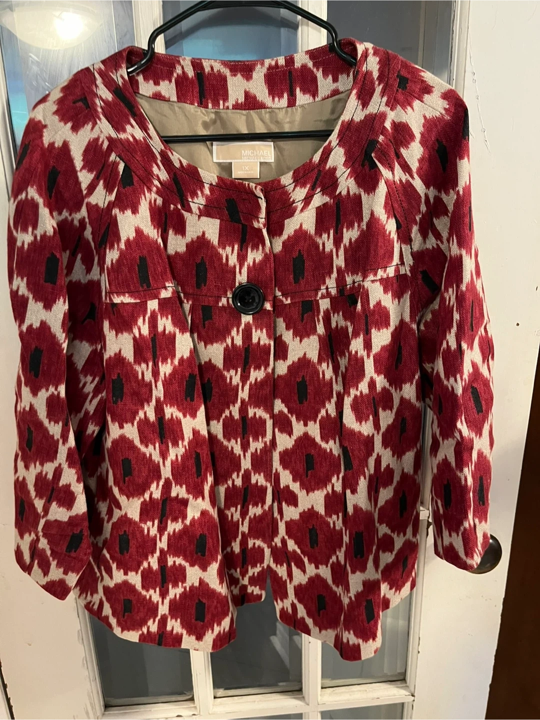 Selling a Michael Kors jacket in size 1X! The jacket features a unique red and white pattern. It's in great condition and ready for a new home