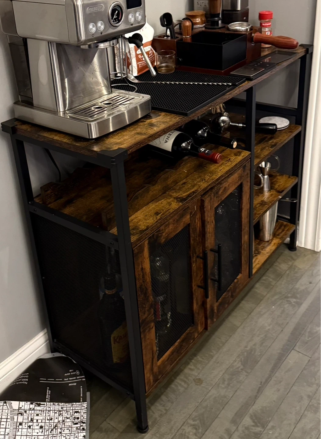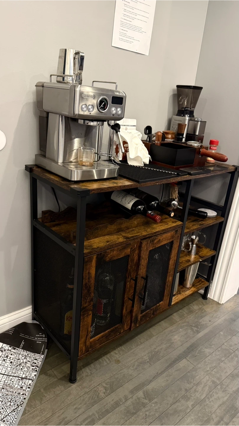 I'm selling a VASAGLE Bar Cabinet in rustic brown! It's perfect for storing your favorite drinks and bar accessories. The cabinet features a sturdy metal frame and rustic brown wood finish, adding a touch of vintage charm to any room. It has plenty of space for wine bottles, glasses, and other essentials. The mesh doors add a stylish touch while keeping everything organized and out of sight