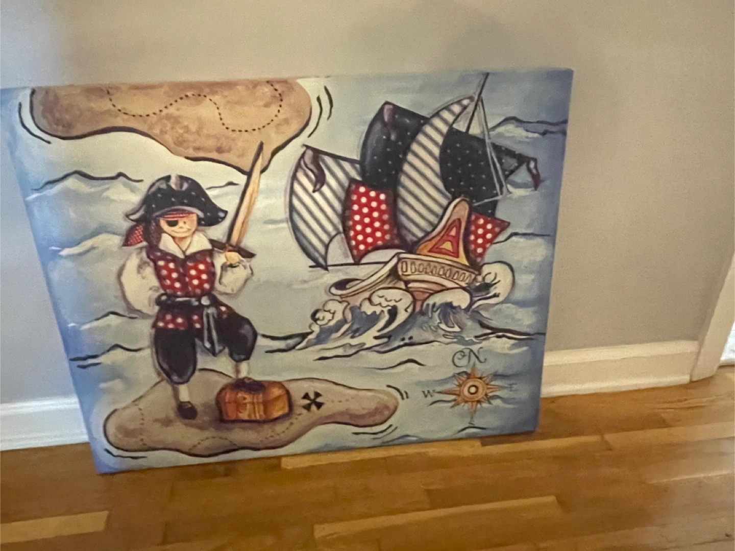 10A fun pirate-themed painting, perfect for a child's room or play area! It features a pirate, a treasure map, and a ship sailing on the waves