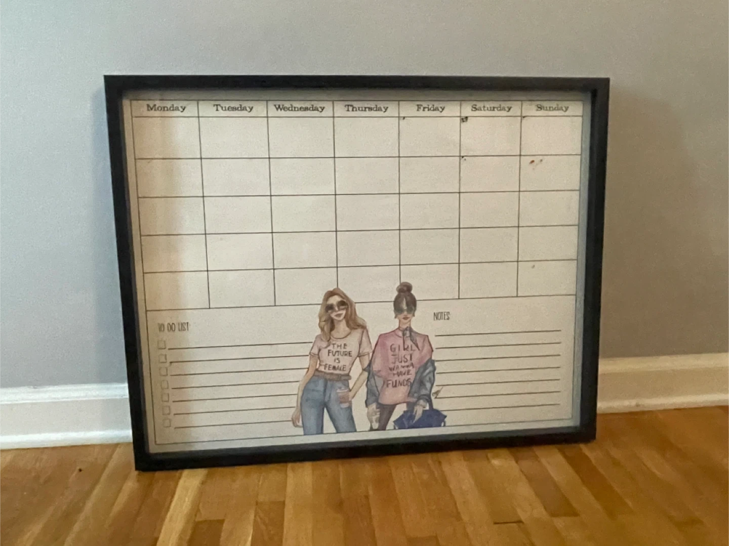 10Selling a framed wall calendar. It features a blank calendar grid at the top, with a 'To Do List' and 'Notes' section below. The illustration at the bottom shows two women with text that reads 'The Future is Female' and 'Girl Just Wanna Have Funds'