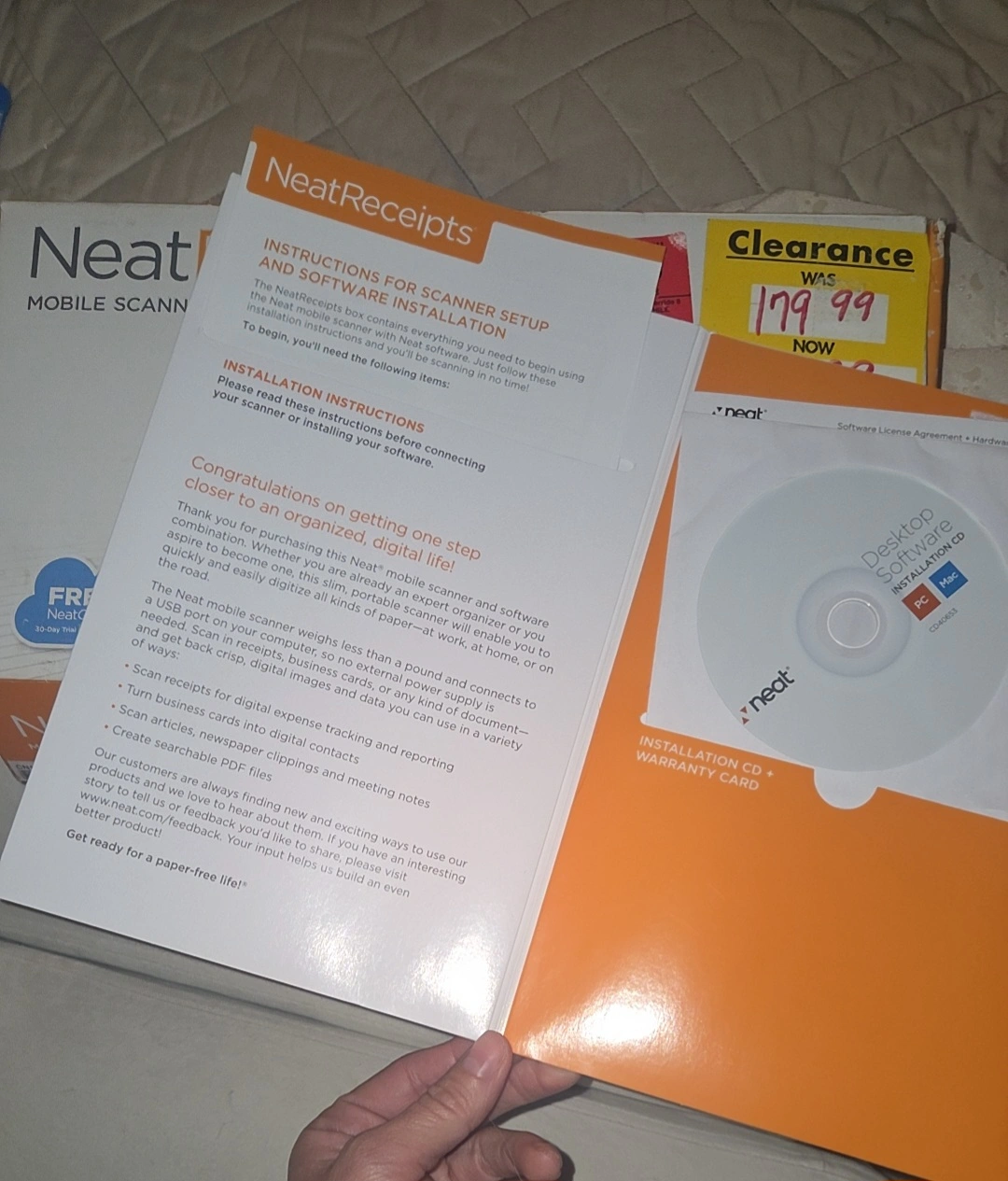 10Selling a NeatReceipts Mobile Scanner + Digital Filing System. It is a mobile scanner that weighs less than a pound and connects to a USB port on your computer. It can scan receipts, business cards, articles, newspaper clippings, and meeting notes. It also creates searchable PDF files. It comes with the box, software installation CD, and instructions. Originally, it was priced at $179.99. I bought it for $80 & would like to sell it at same price. i dont have a cd holder to install the software on my computer.