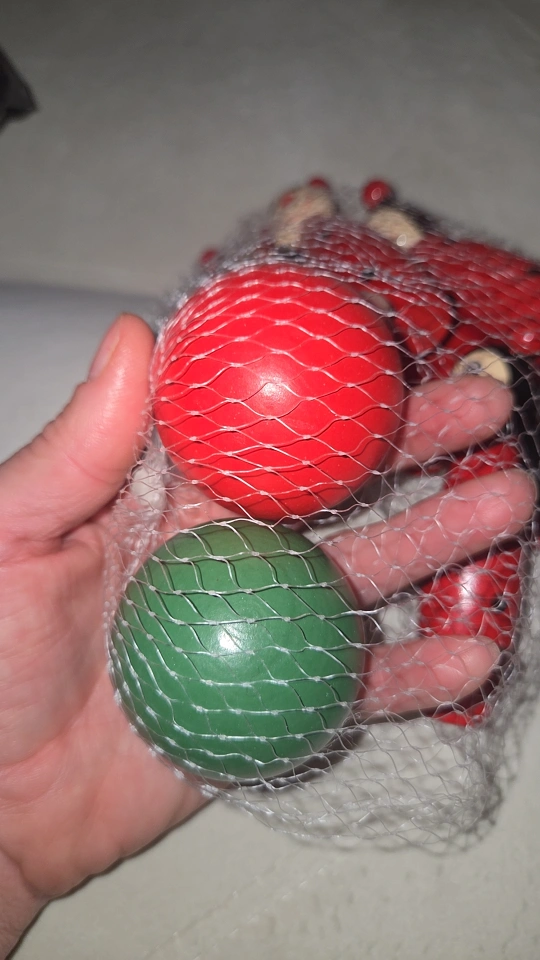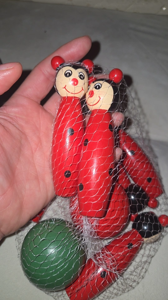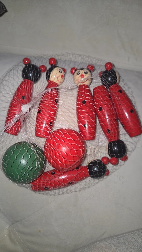 10Here's a cute wooden bowling set featuring ladybug-themed pins and colorful balls! It's perfect for toddlers and young children to develop their hand-eye coordination and have fun. The set includes several ladybug pins and a couple of balls in red and green. Brand New. In pristine condition. handmade in Italy. brought back from a trip to Italy & never ended up using it.