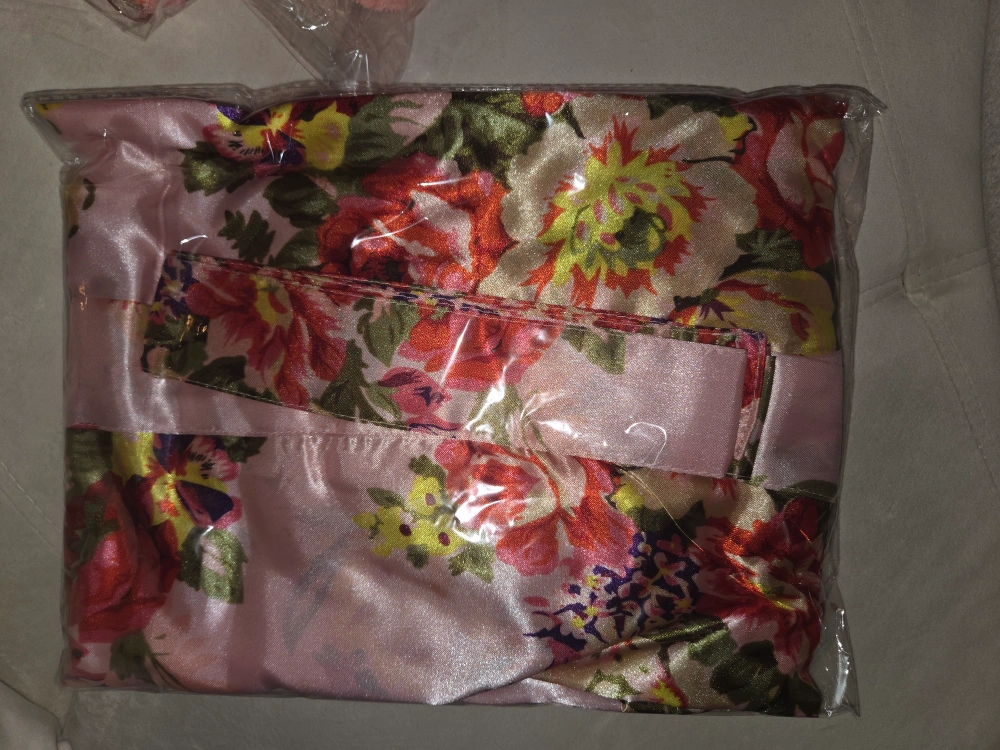10Selling a brand new floral robe from Dreamline! It's still in the original packaging and has a beautiful floral pattern on a light pink background. Perfect for lounging or getting ready! Satin Fabric Lightweight. Length: Above your knees