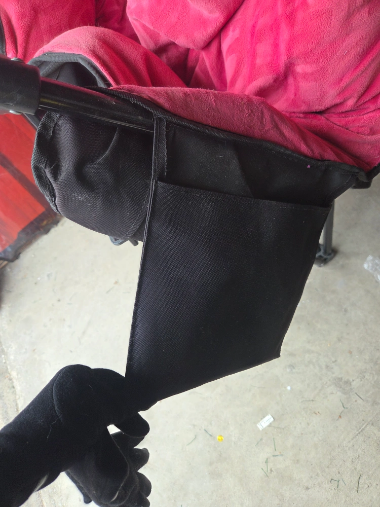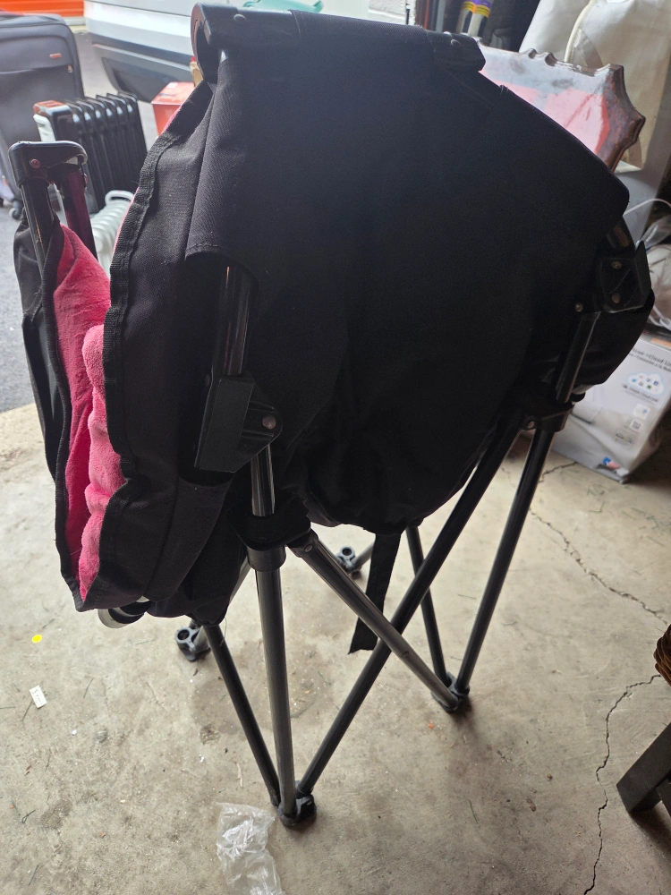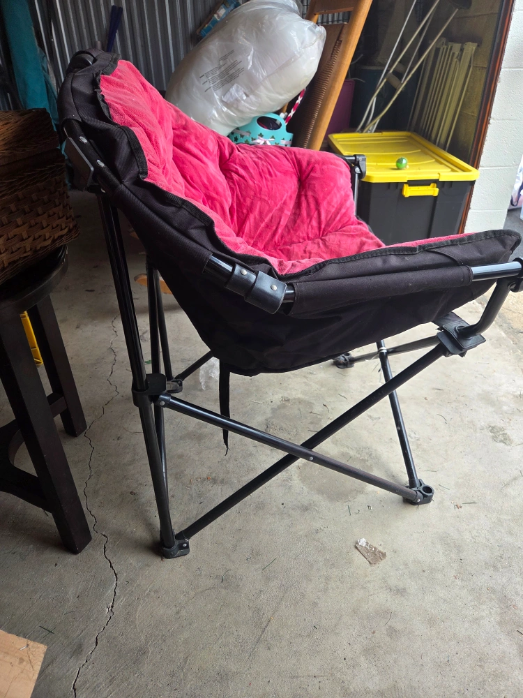 Selling a comfortable papasan, inward folding, chair with a pink cushion! It features a sturdy black frame and a cozy, cushioned seat. Perfect for relaxing indoors or outdoors. It has a convenient side pocket for storing small items. in very good condition.