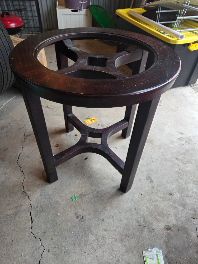 Selling a round brown wooden table. It shows some signs of wear, with some scratches on the surface. It's a sturdy piece of furniture that could be a great addition to your home, for someone with DIY refinishing skills.