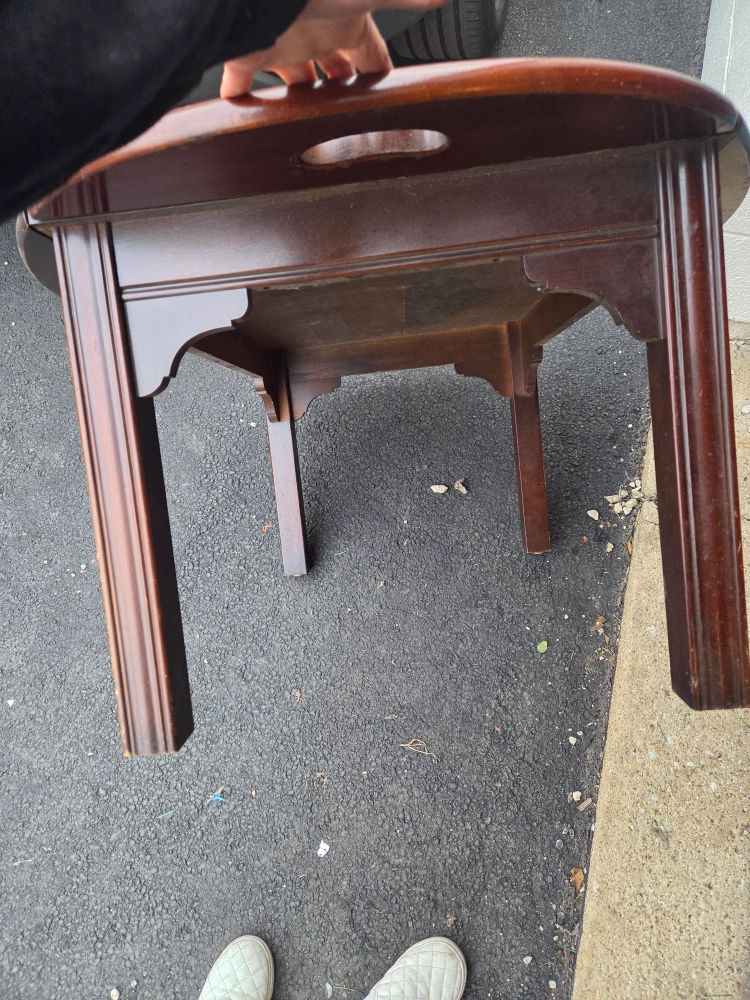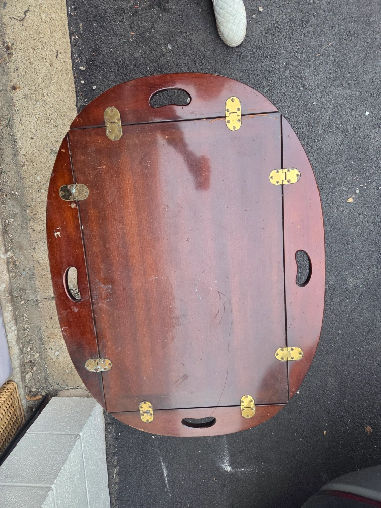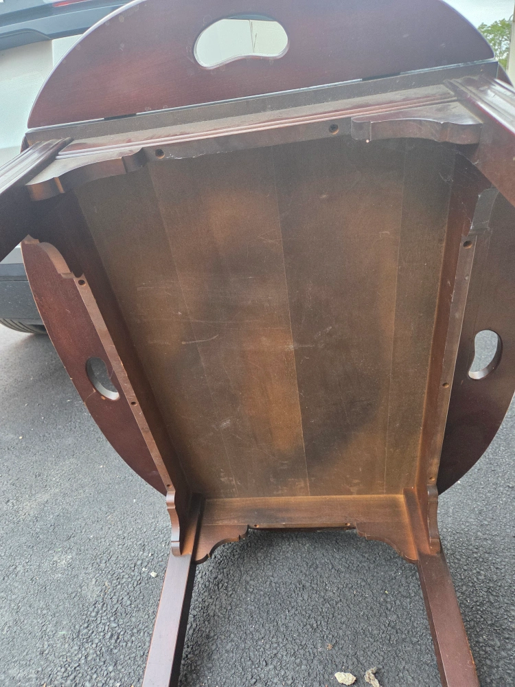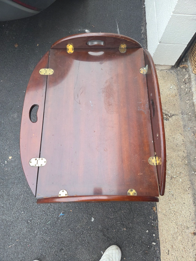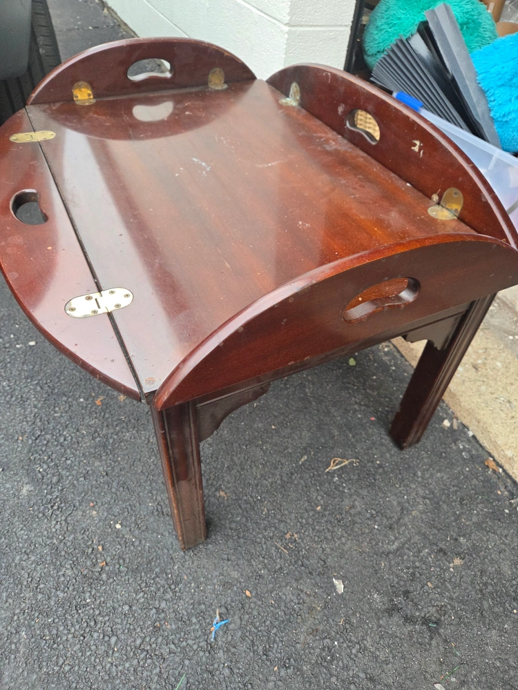 10Selling a vintage mahogany butler tray table! It has a rich, dark wood finish. The tray top can be folded down. There are some signs of wear and tear, but it's still a beautiful and functional piece of furniture