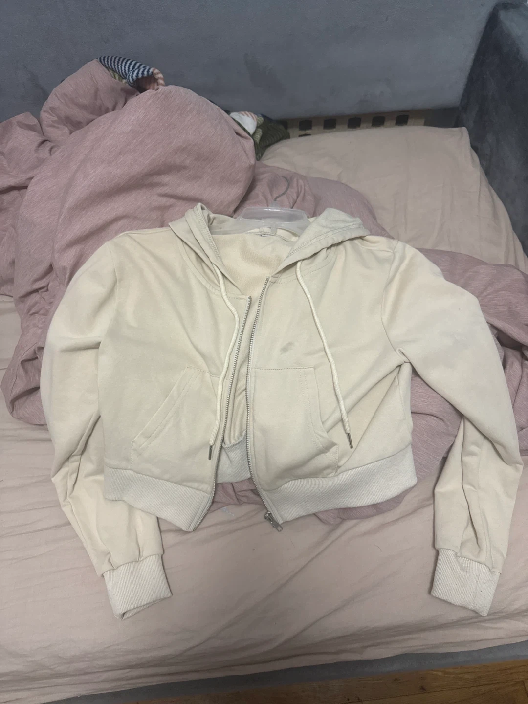 Selling a cute beige cropped hoodie! It's in great condition and perfect for layering. The zipper works perfectly and the hood is nice and cozy