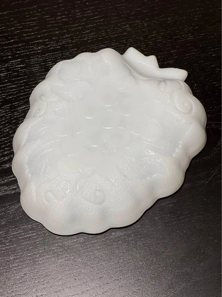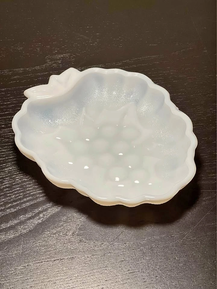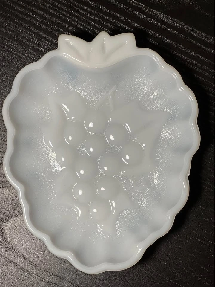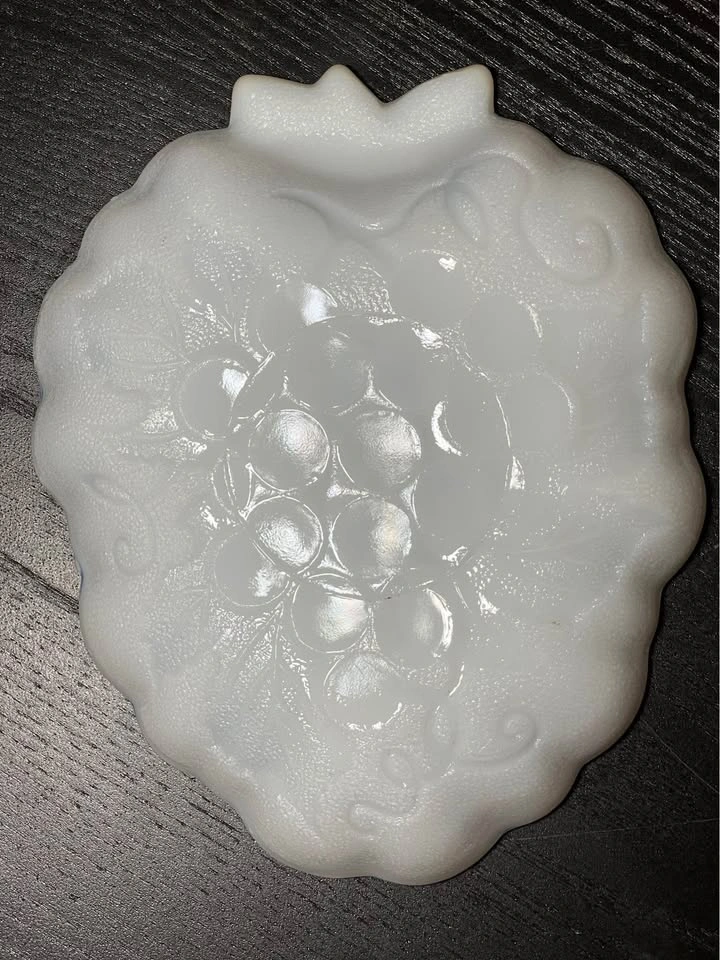 131This item is a vintage white milk glass dish featuring an embossed grape and leaf design. This specific shape and pattern were popular in the mid-20th century and were produced by several prominent American glass manufacturers, including Hazel-Atlas, Anchor Hocking, Westmoreland, and Indiana Glass Company. Type: Milk glass dish, often referred to as a candy dish, trinket dish, or relish tray. Material: Opaque white pressed glass. Pattern: Grapes and leaves, which is a very common motif for vintage milk glass. Makers: The exact manufacturer can be difficult to determine without a specific maker's mark, as many companies used similar designs or molds. Hazel-Atlas is frequently associated with the grape cluster shape seen in the image. Era: These dishes were typically manufactured between the 1940s and 1980s.