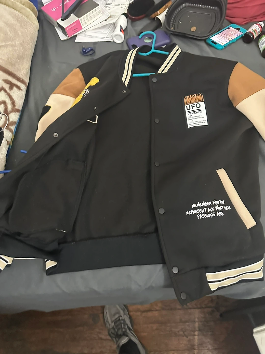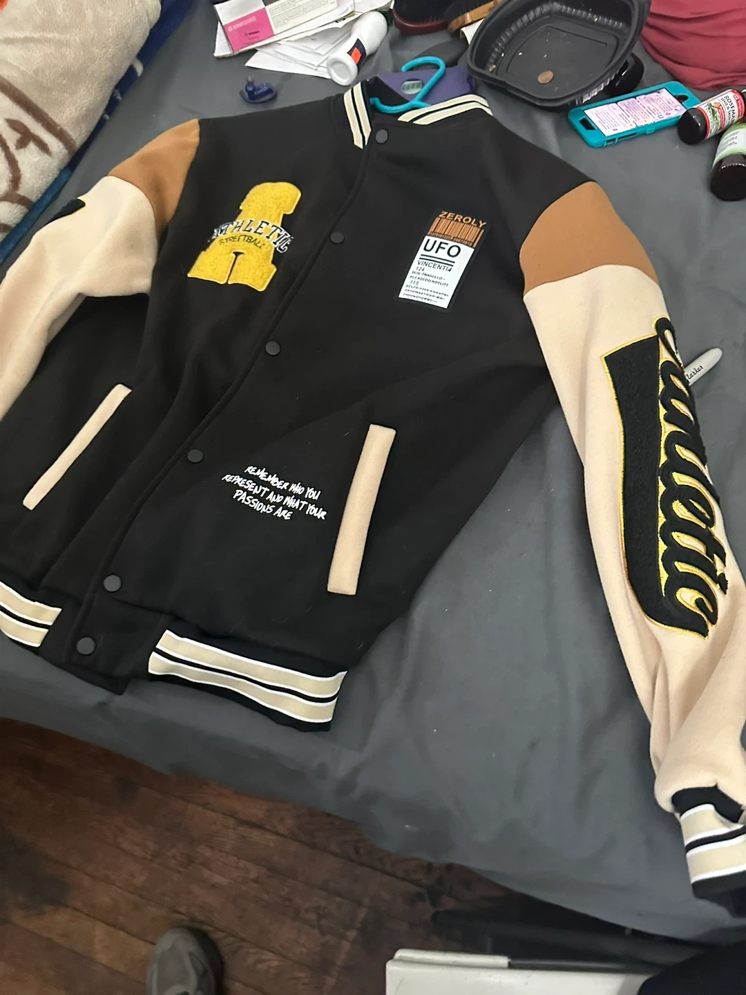 Selling a Zeroly UFO varsity jacket! It's black with beige and brown sleeves, and has an "Athletic Streetball" patch on the front. The jacket also features the text "Remember who you represent and what your passions are".