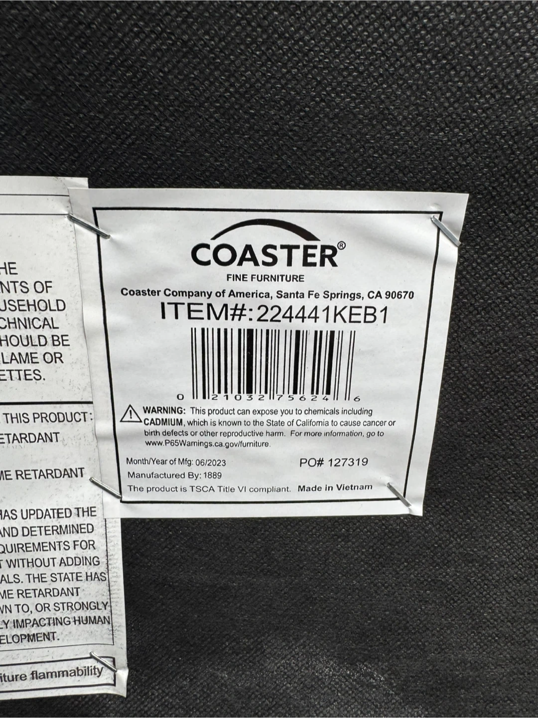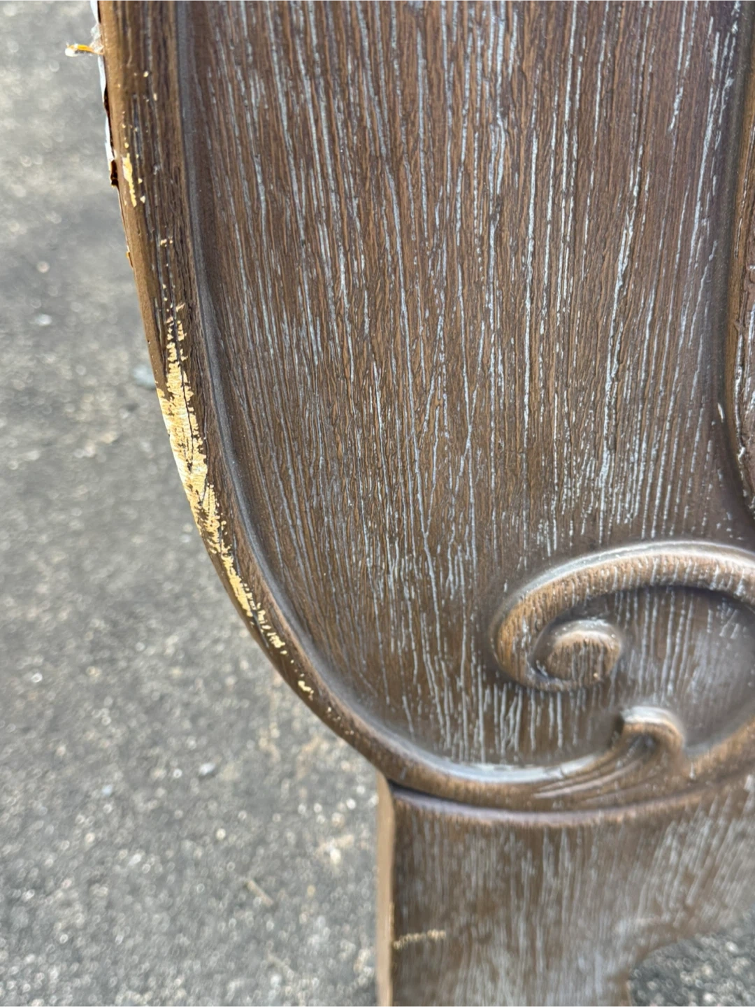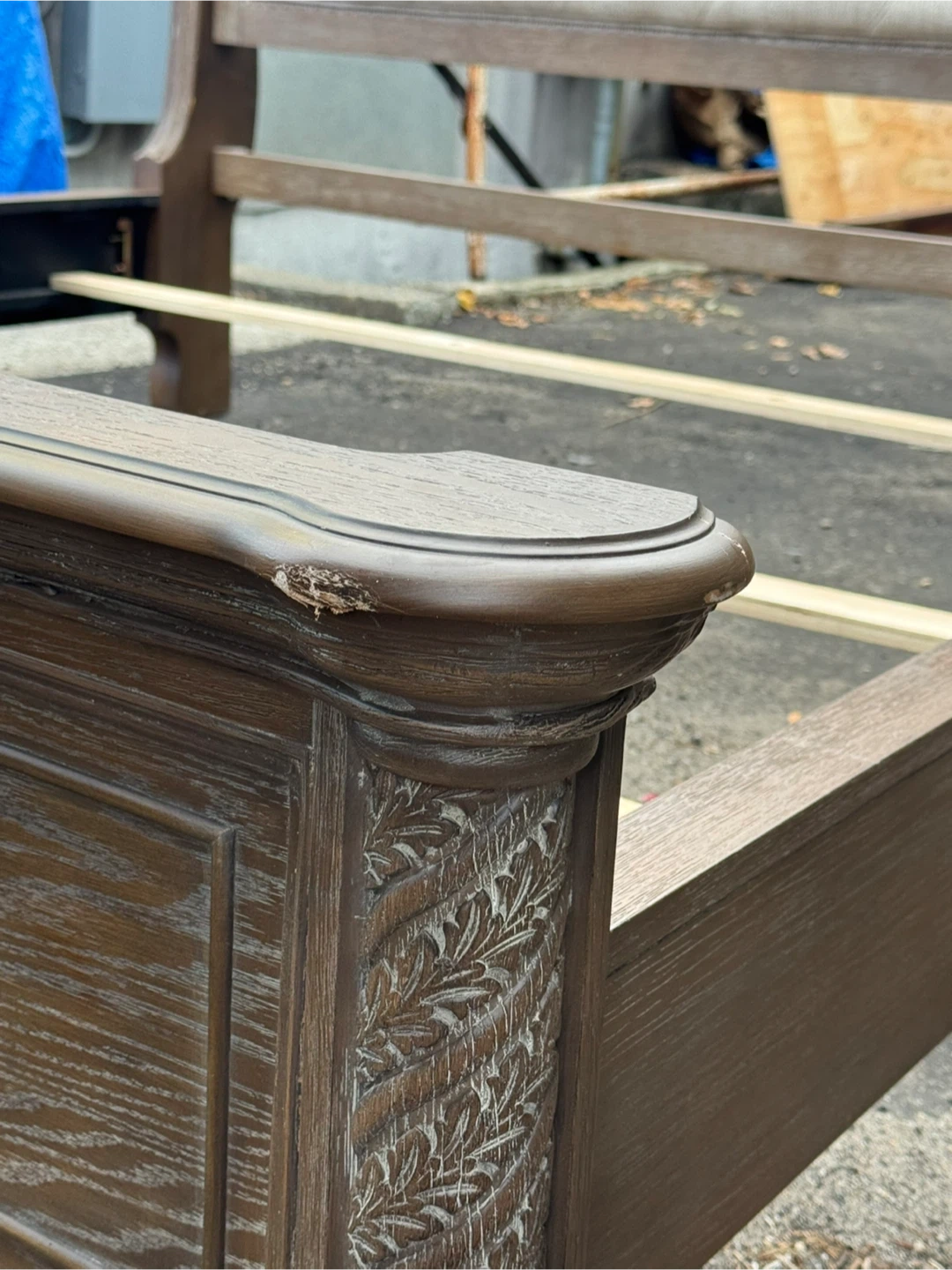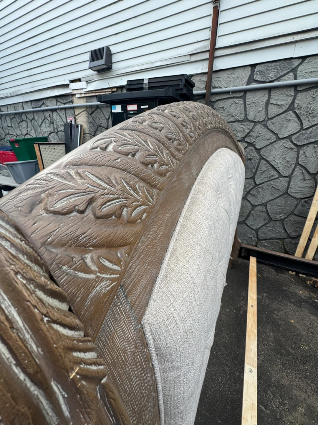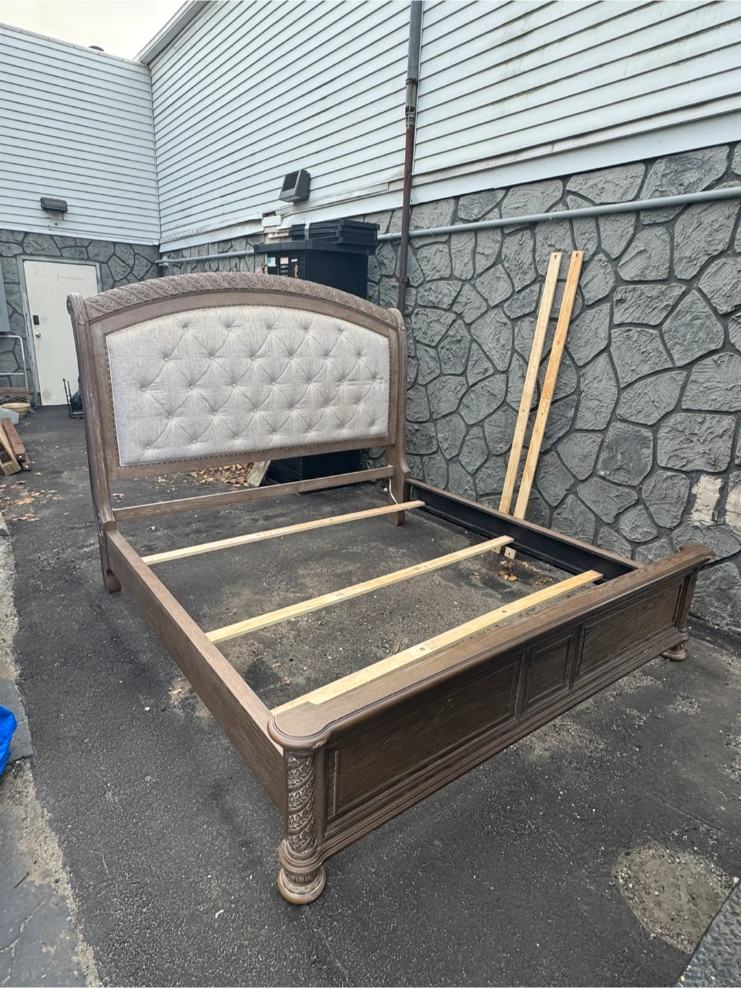 89Selling a King-sized bed frame with an upholstered headboard. It features a tufted design and a decorative wood frame. The frame has a brown finish. Has some scratches and marks but in overall very good shape. 86.5” widest (foot of bed) 68” tallest (headboard) 94” Deep 15” top of the side rails to the floor 7.5” floor to bottom of side rails **Willing to Deliver**