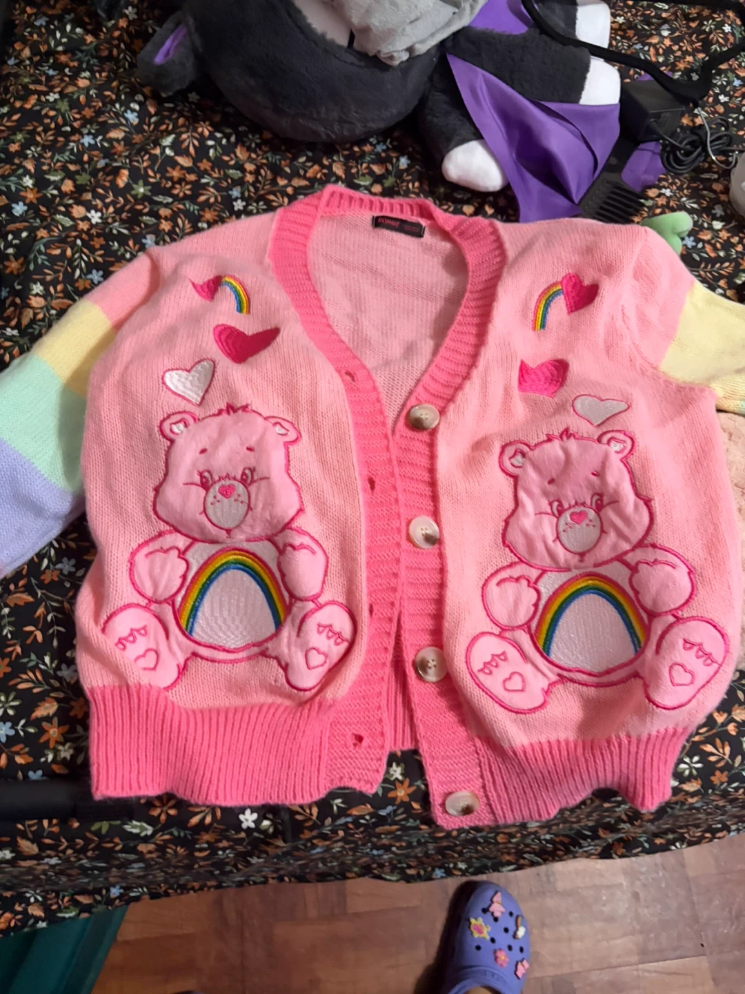 Super cute pink Care Bears cardigan! It features rainbow sleeves and embroidered details of Care Bears, hearts, and rainbows. Perfect for adding a touch of nostalgia and fun to your wardrobe. Never worn or used and was just in my storage.