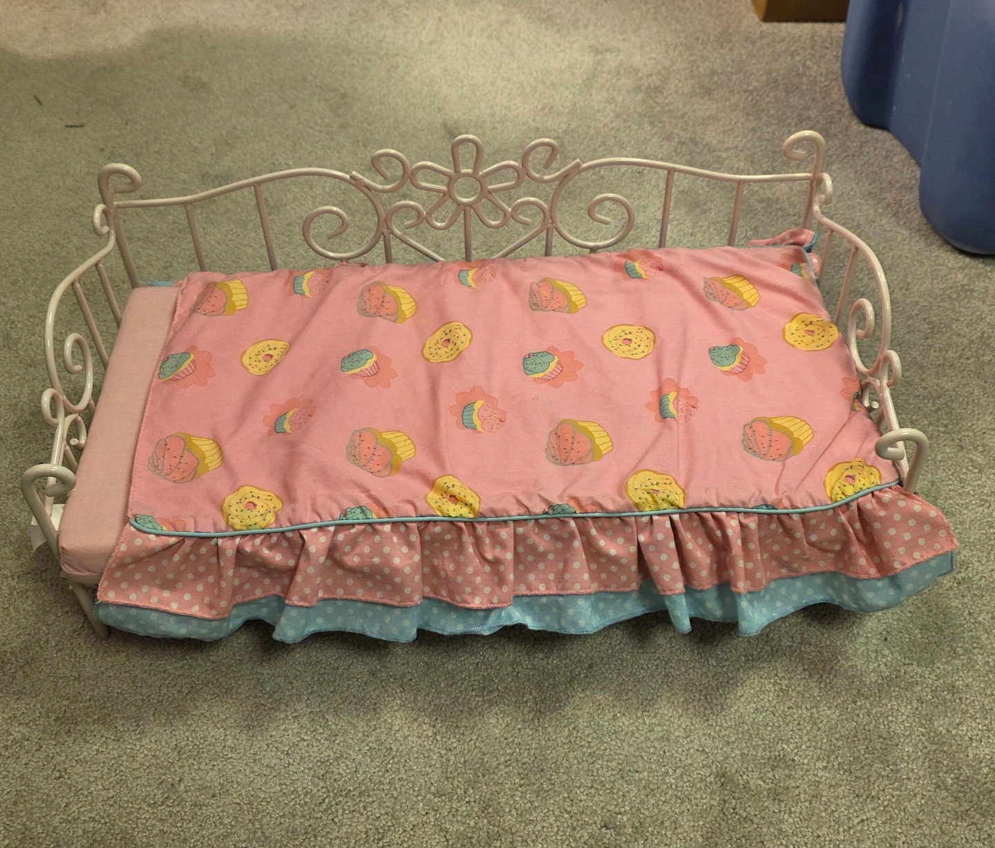 This doll bed has a charming pink metal frame. It comes with a pink mattress and a matching blanket featuring a cute cupcake design. Perfect for your little one's dolls!
